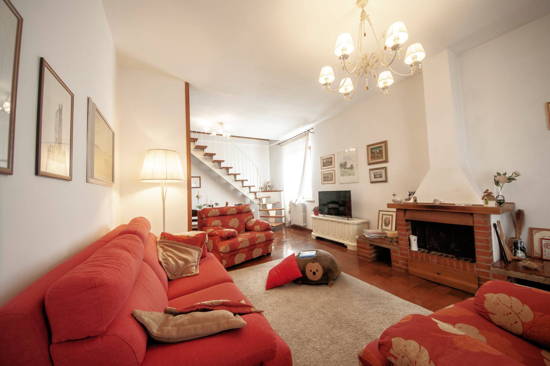 Si accede direttamente al primo piano della bifamiliare attraverso una bella scala esterna e allinterno si compone di: ingresso, ampia cucina con piccolo ripostiglio, soggiorno con camino e sala da pranzo, tre camere da letto e un bagno con vasca.
