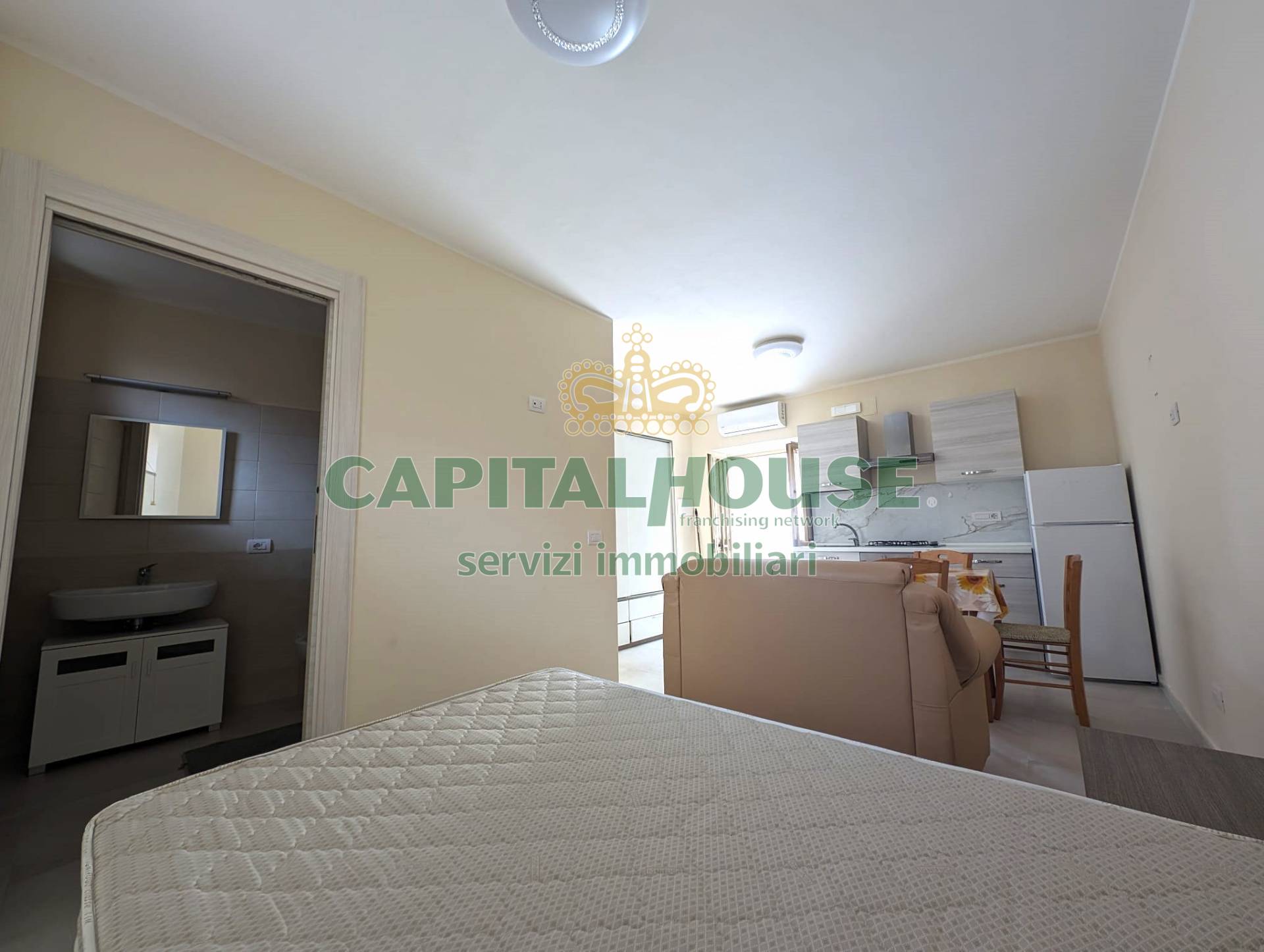 Composto da un unico locale, dove vi un area giorno con cucina, tavolo con sedie, e divano, mentre l'area notte divisa da un armadio che crea la privacy giusta, infine vi un bagno con doccia e attacco per lavatrice.
