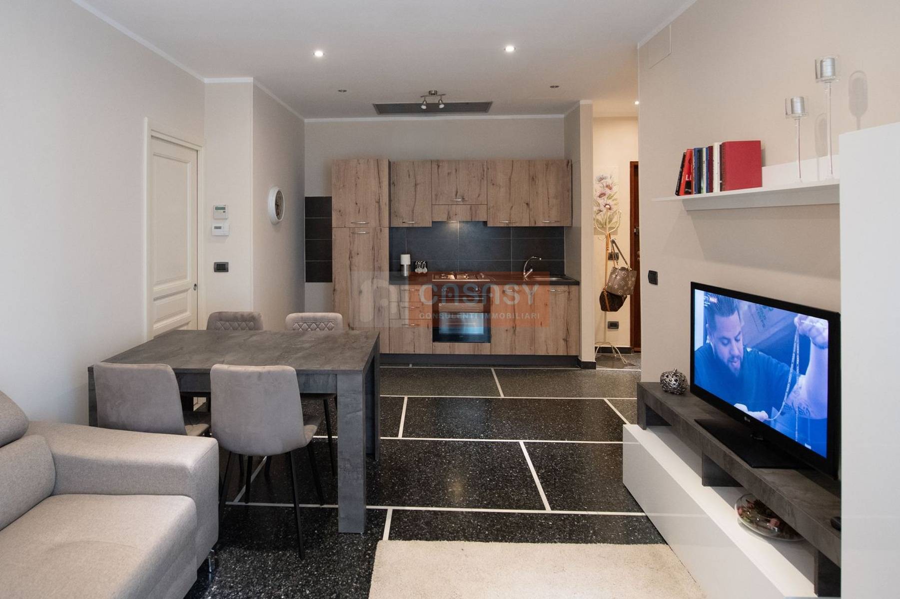 Lingresso si apre su un luminoso ed ampio soggiorno con cucina a vista, uno spazio accogliente e funzionale.