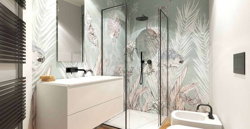Entrambe le unit presentano pavimenti in gres porcellanato effetto parquet di grande formato, rivestimenti effetto marmo o carta da parati in fibra di vetro, sanitari sospesi, piatto doccia in resina effetto pietra e rubinetteria nero satinato.