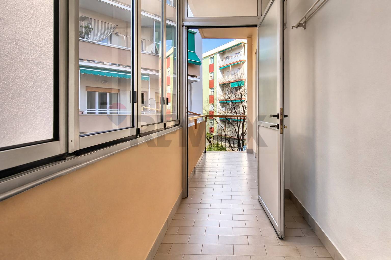 Una camera e il bagno affacciano sul balcone in parte verandato.