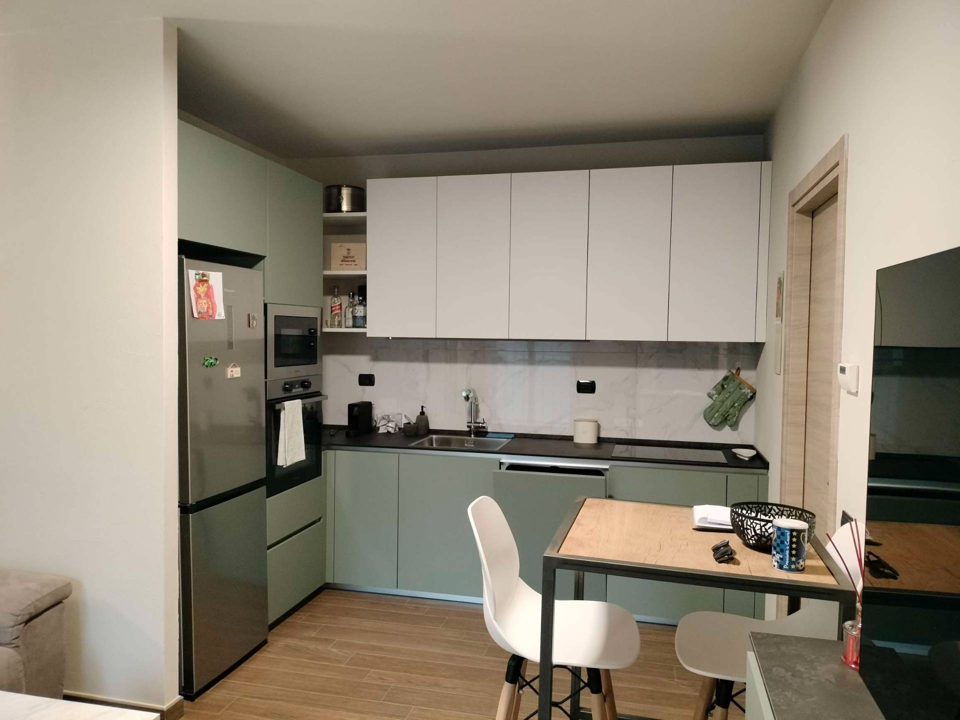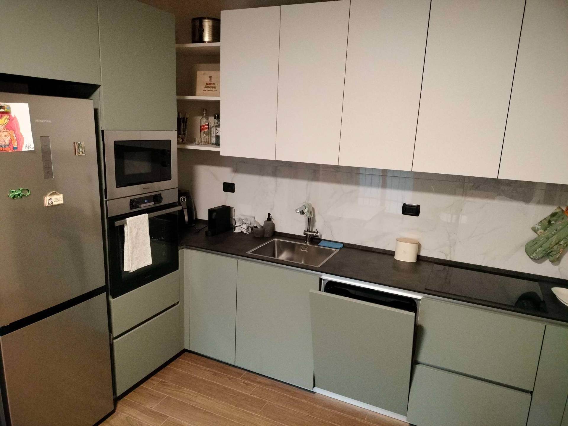 La zona giorno composta da ingresso sulla sala con l'angolo cucina, nascosto, angolare e su misura ed ha l'uscita diretta sul verde privato.