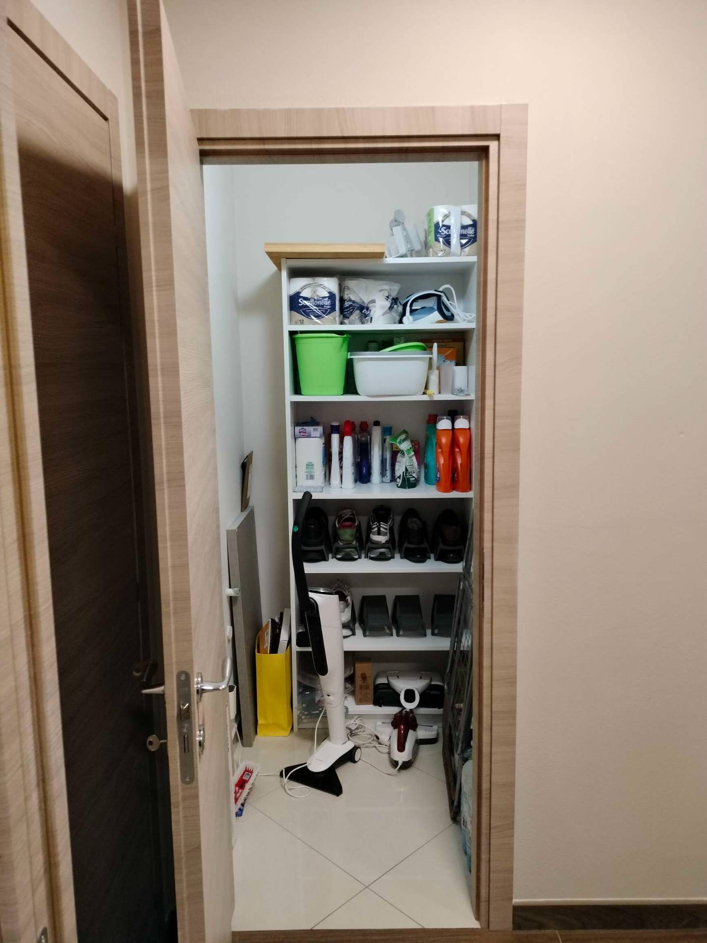 Piccolo disimpegno tra le due zone con la lavanderia che funge anche da ripostiglio, ampio, la camera da letto con una capiente cabina armadi ed il bagno, finestrato, con box doccia in cristallo.