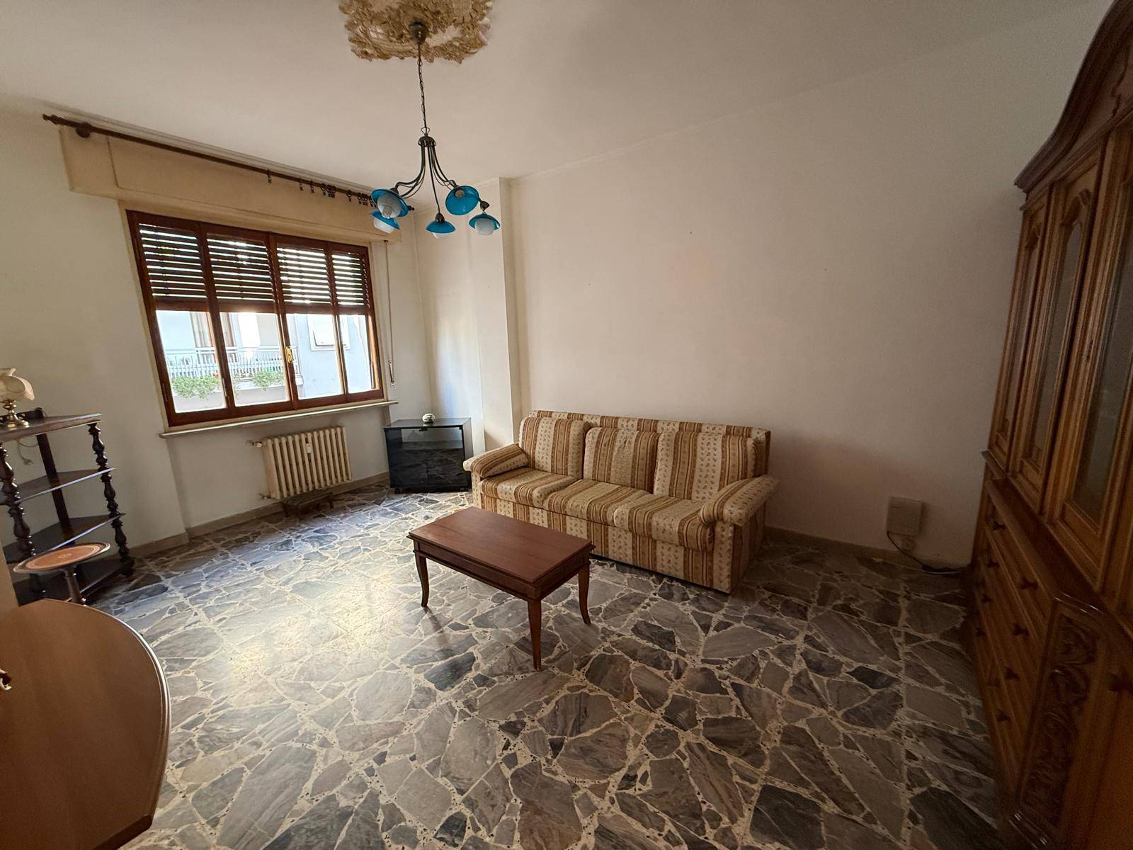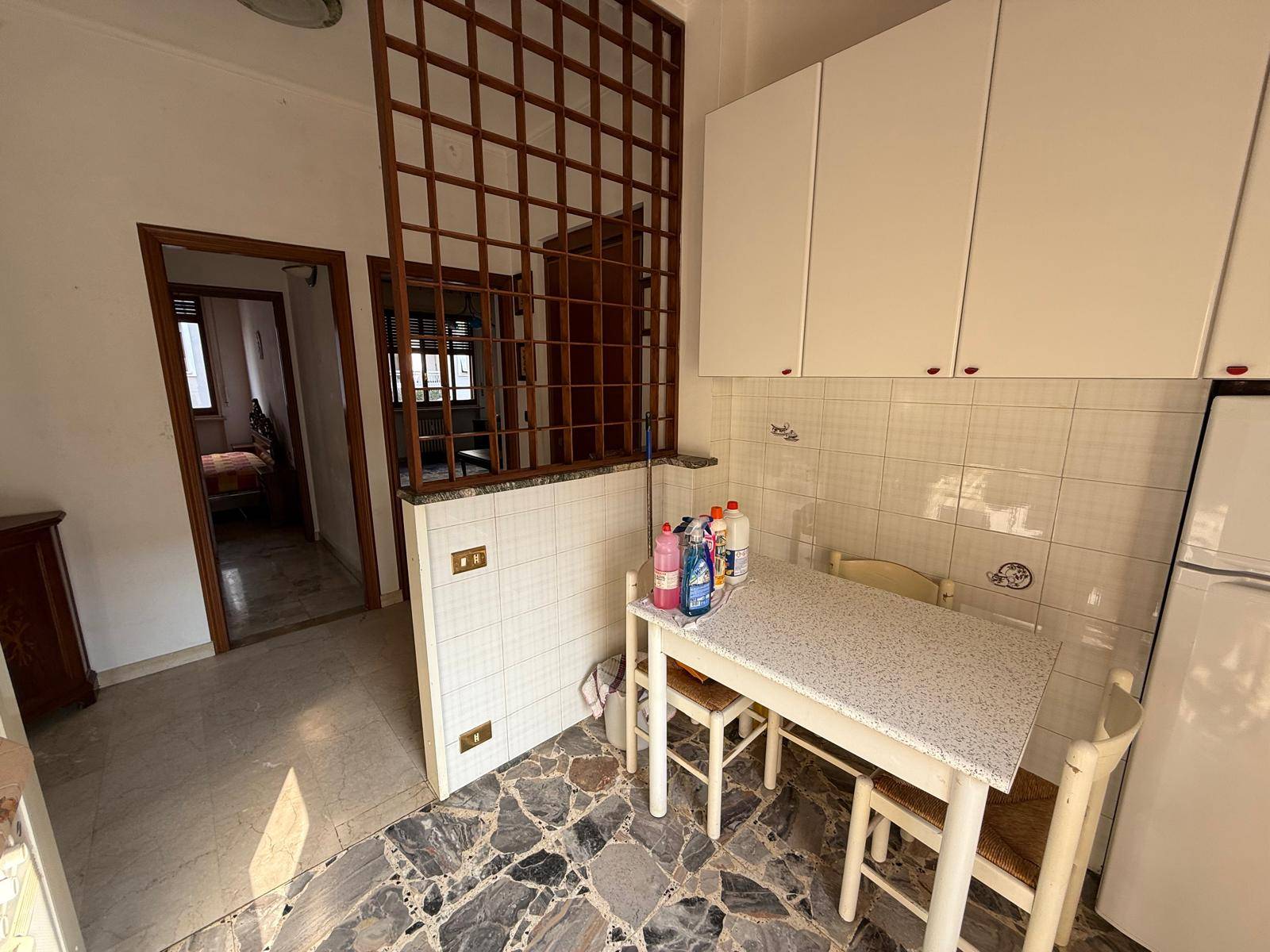 Porta blindata, infissi in legno, pavimentazione in marmo.