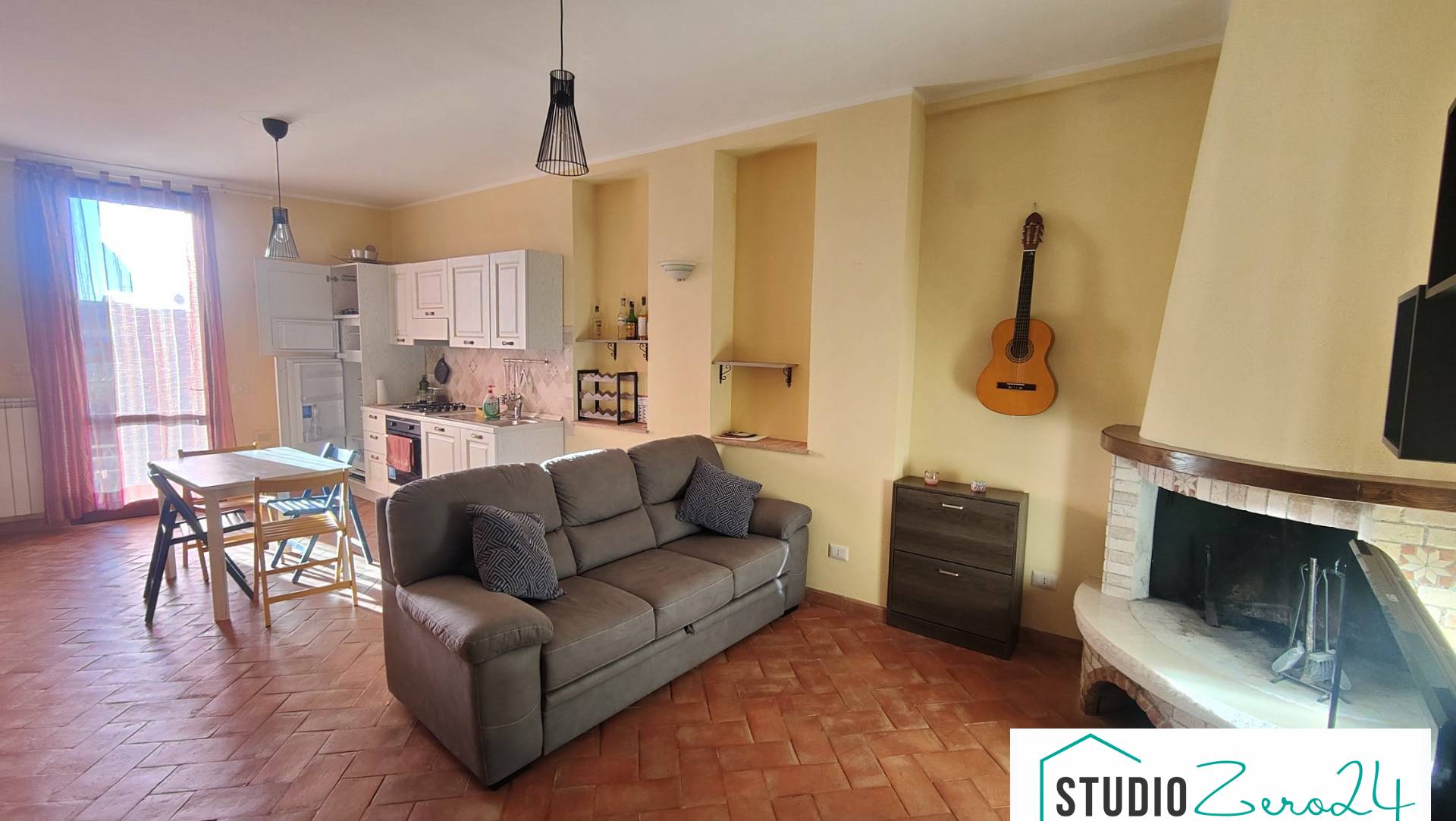 Entrate in un ampio salone inondato di luce dove l'atmosfera si accende attorno a un magnifico camino affiancato da una cucina a vista moderna e funzionale.