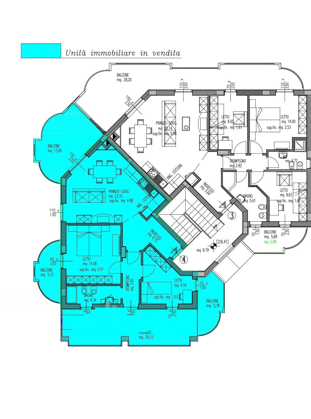 Lunit ha un terrazzo abitabile di circa 20,00 mq e tre balconi di circa 5,00 mq cadauno.