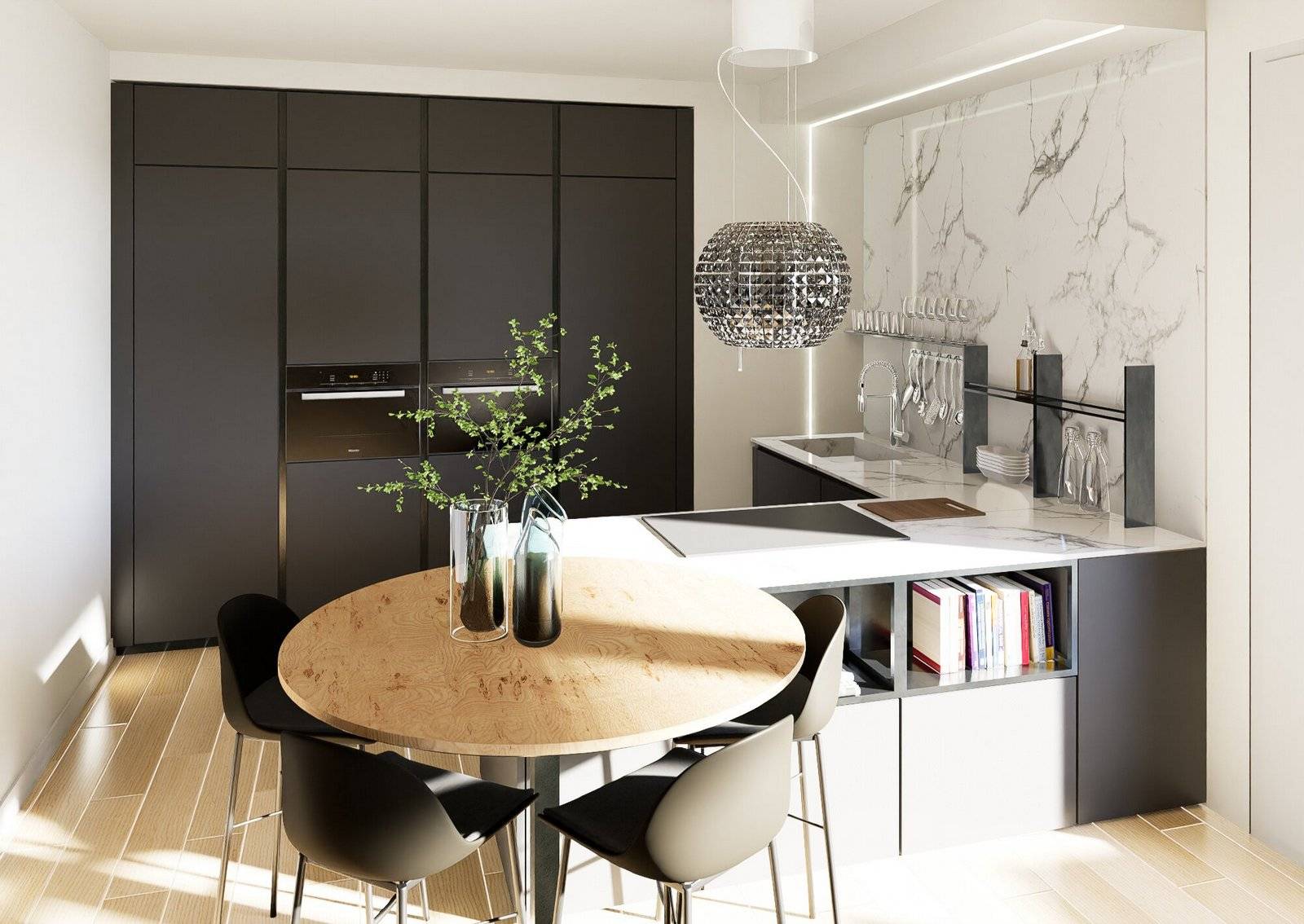 La cucina a vista, integrata nella zona soggiorno, ideale per essere sempre in compagnia.