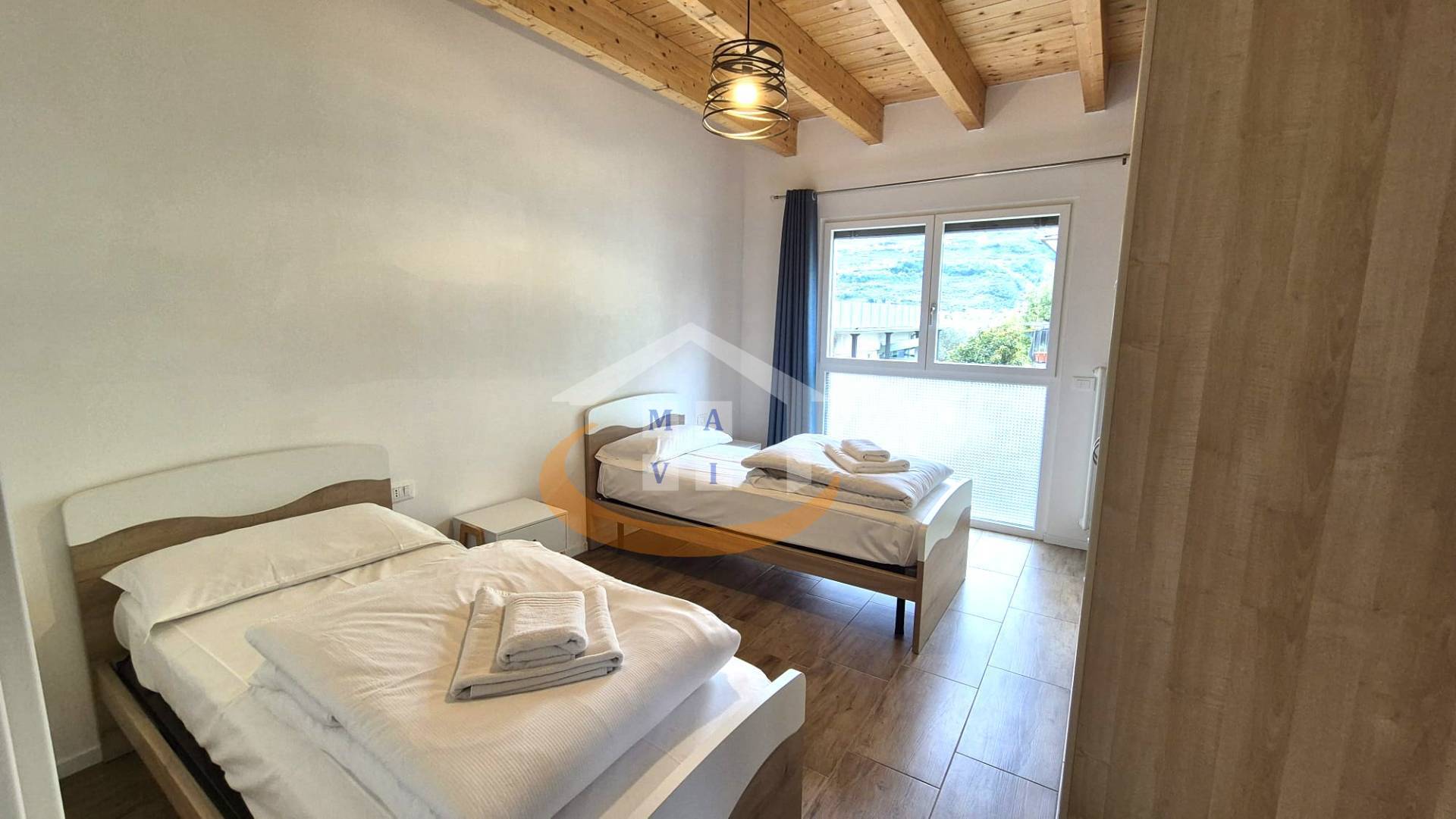L'appartamento occupa il piano primo di un edificio di solo 2 appartamenti, con una esposizione completa su 4 lati. Ampia terrazza con esposizione ad est ,vista castello di Arco. L'immobile suddiviso con una zona giorno con angolo cottura, camera matrimoniale con balconcino privato, due ampie camere singole, bagno di 8 mq con Velux, ripostiglio con attacco lavatrice.