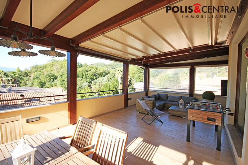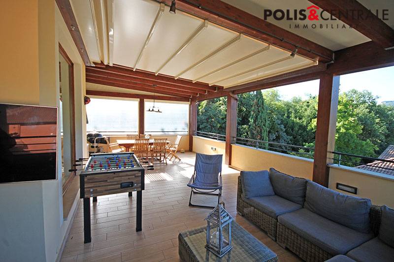 La terrazza, dotata di un elegante pergolato in legno, il luogo perfetto per rilassarsi e godere della vista panoramica.