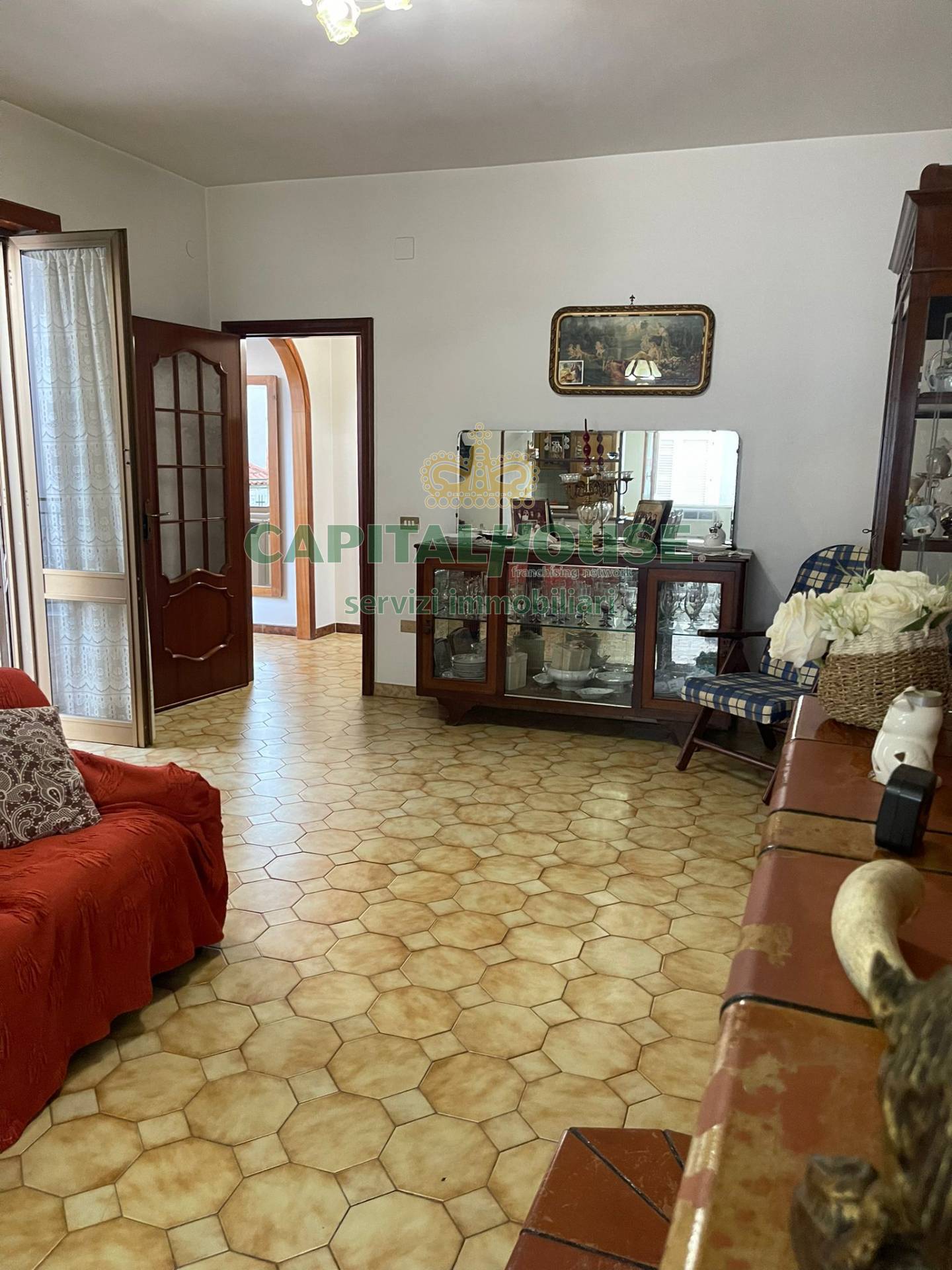 L'appartamento si trova al primo piano ha una metratura interna di circa 90 mq composta da salone con angolo cottura, due camere da letto e il bagno.