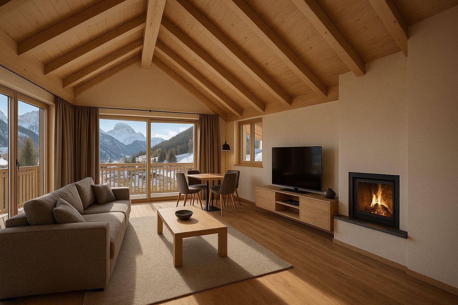 In Alta Badia, dove l'alba accende le vette di rosa e il legno profuma di casa, nasce "Sas dal Luna", un attico con mansardache costudisce tutta l'anima delle montagne ladine.