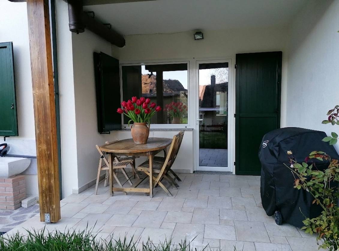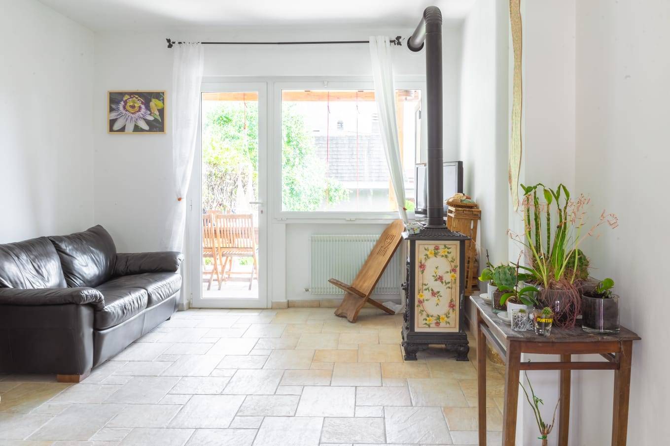 L'ingresso conduce a un luminoso soggiorno che si estende verso il porticato coperto e il giardino privato, ideali per momenti di relax all'aperto.
