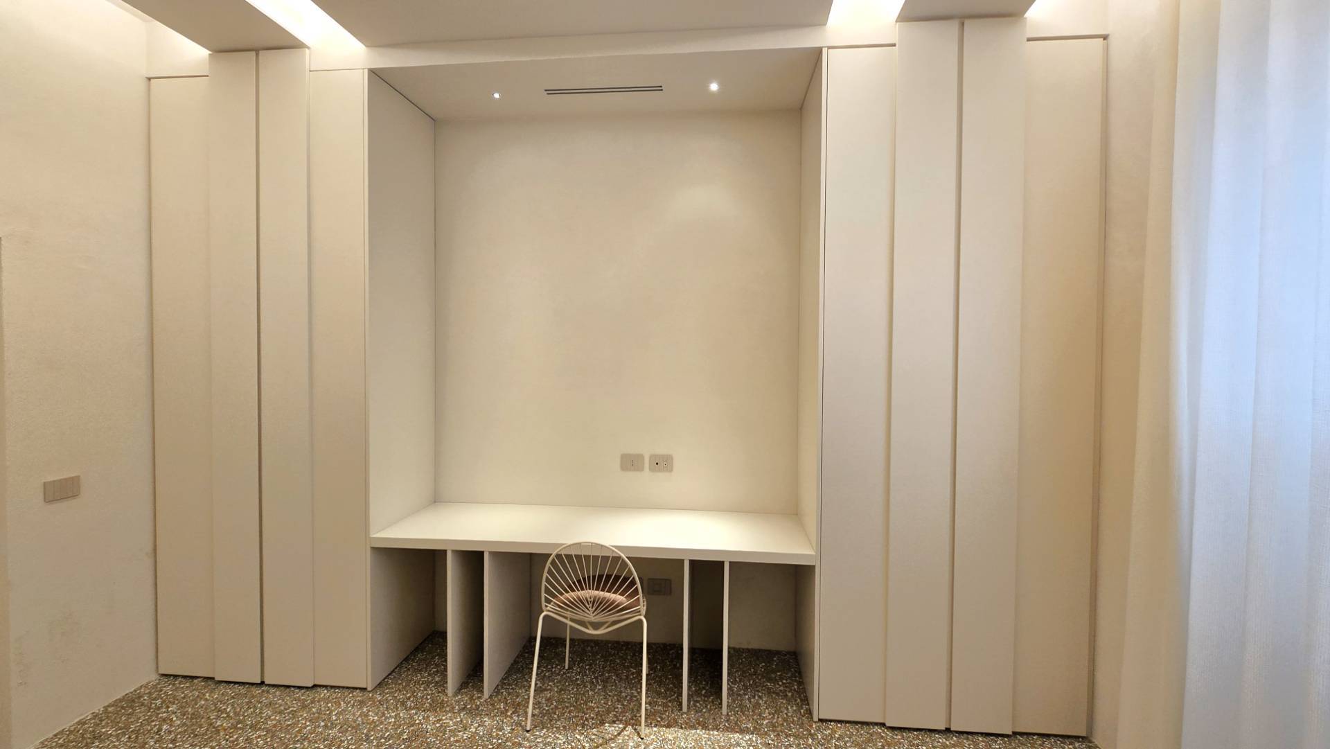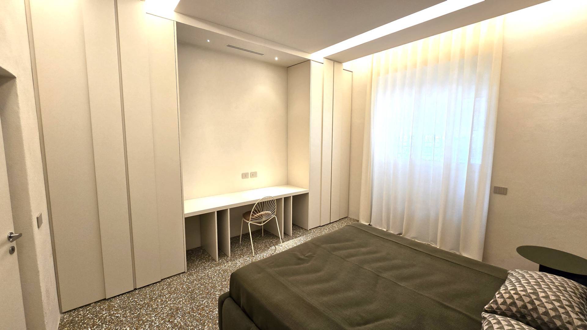 La zona notte composta da una spaziosa camera matrimoniale con armadiature e postazione studio integrate.