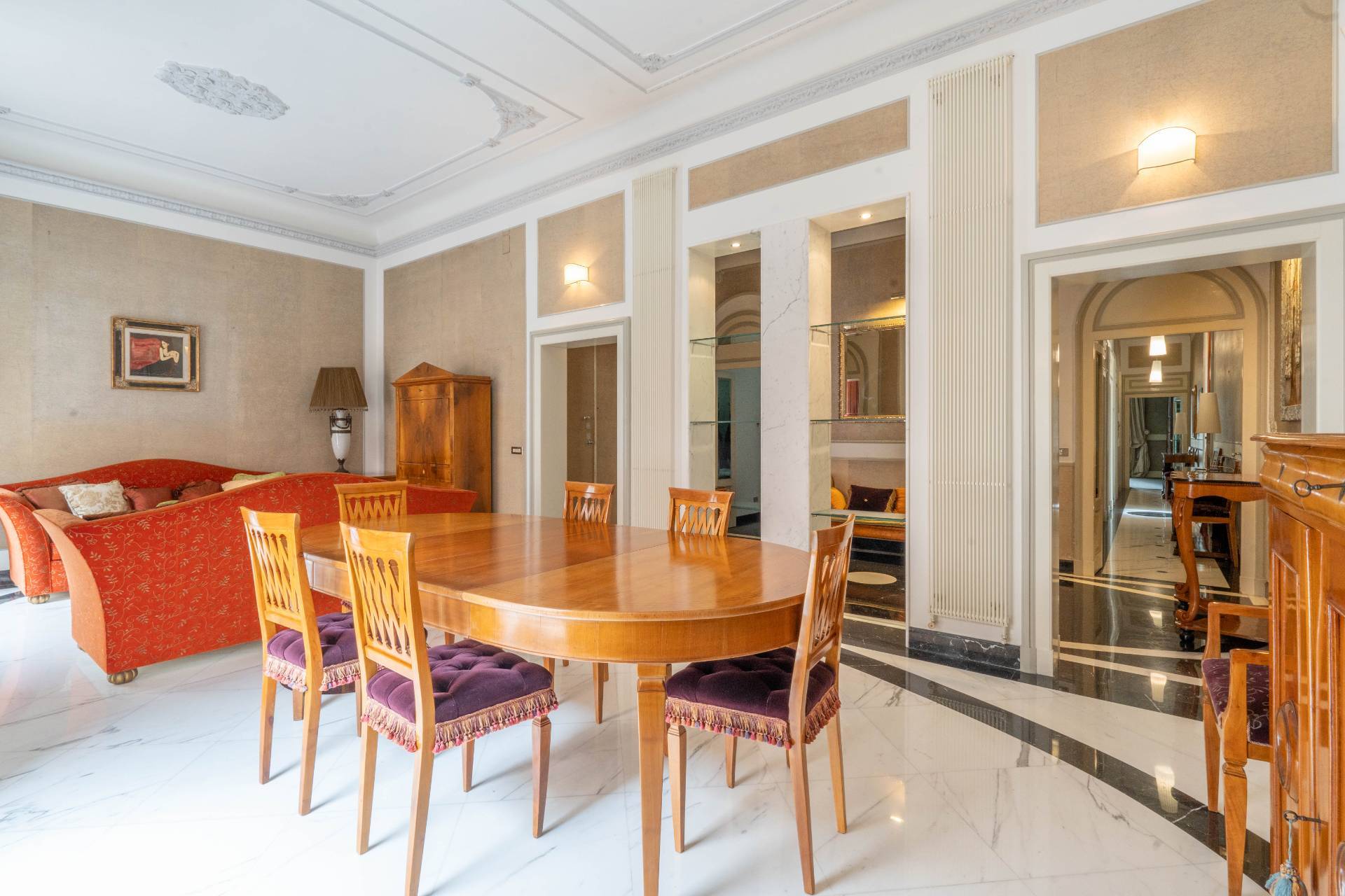 Allinterno, lappartamento si distingue per una ristrutturazione di alto livello, dove materiali pregiati come il marmo di Carrara e il parquet si fondono armoniosamente con arredi depoca Biedermeier certificati e opere darte del Novecento, creando ambienti ricercati e unatmosfera di autentica eleganza.