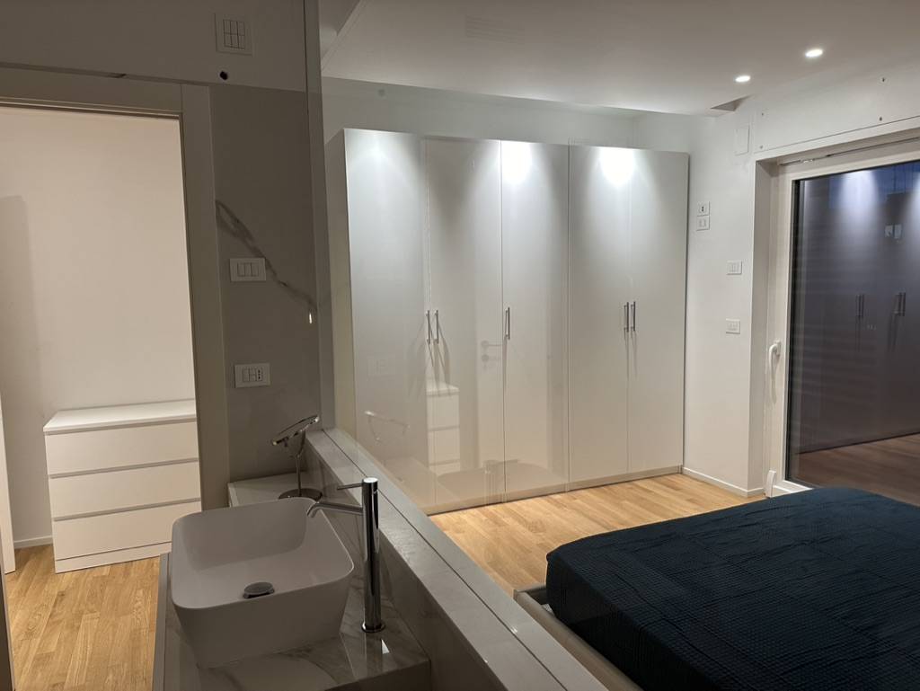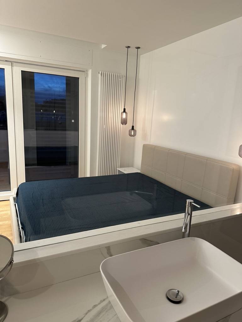 Entrando si viene accolti nel living che si coniuga in continuit con la cooking zone. Attraverso un disimpegno ci accolgono un ampia camera matrimoniale con bagno privato che con un gioco di vetri trasparenti parte scenica della stessa camera ,la luminosit di questa camera assicurata dalla presenza di un balcone con balaustre in vetro e dalla finestra del suo bagno.