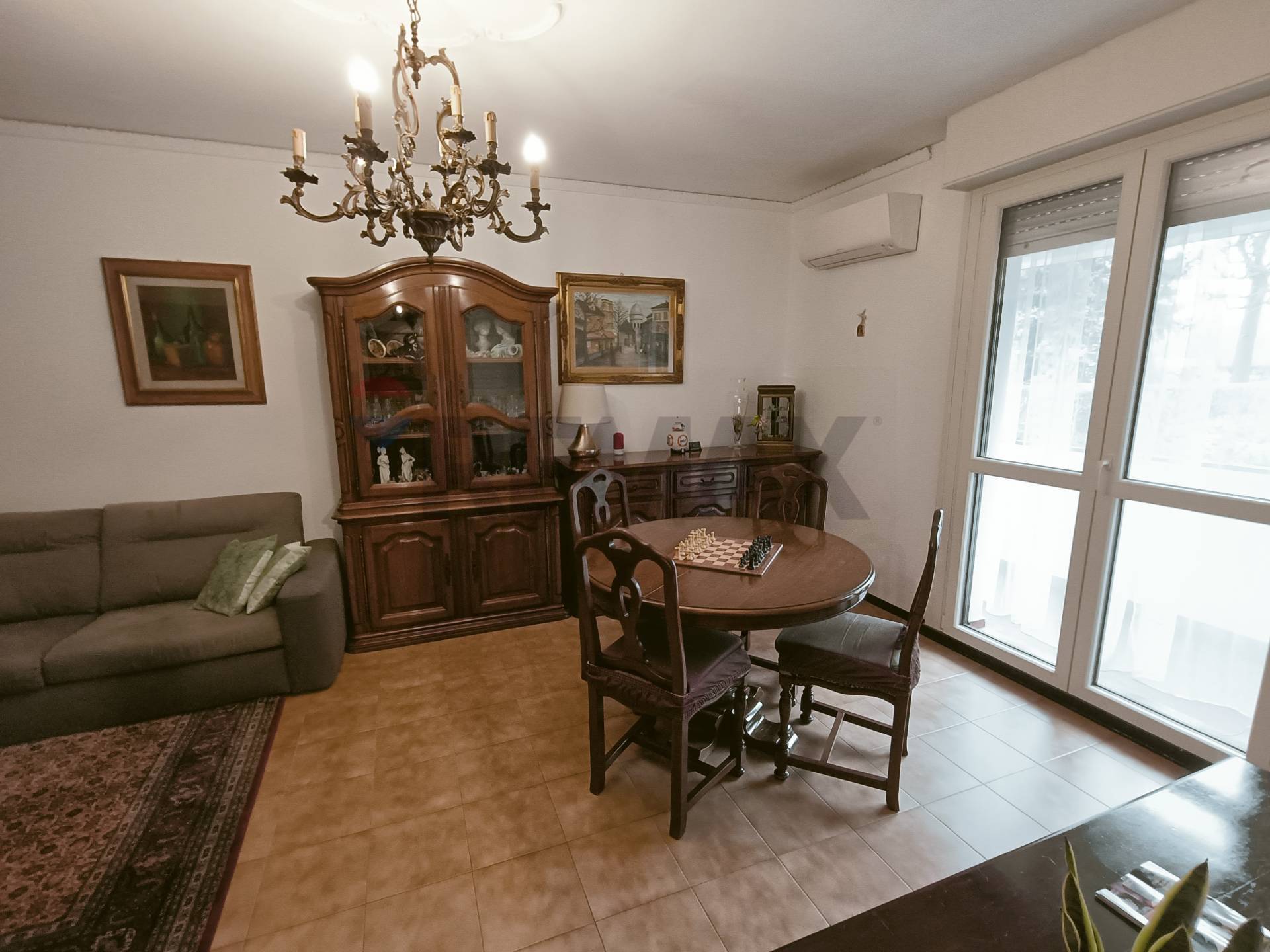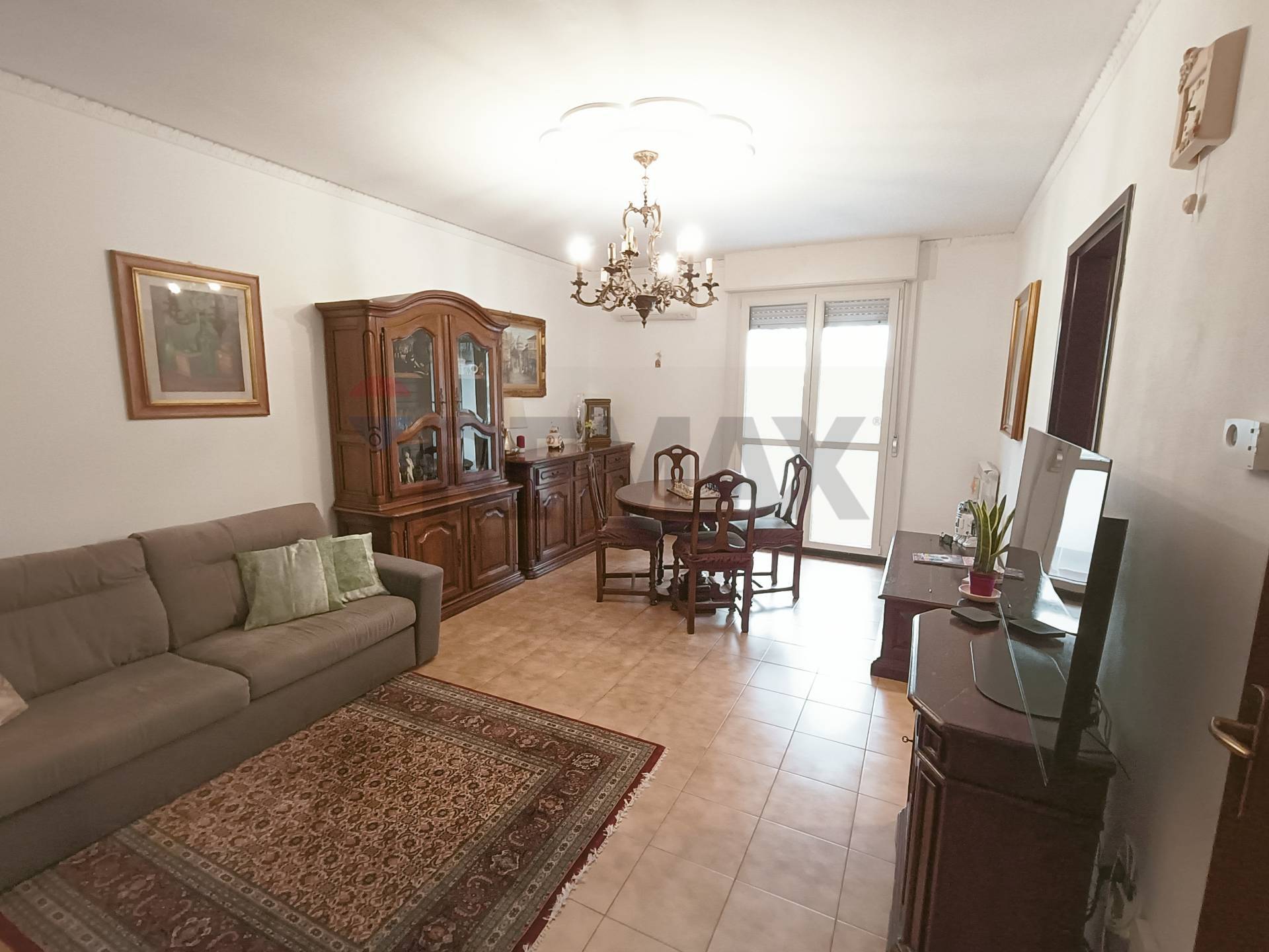 La zona giorno accoglie con un salotto ampio e ben distribuito, un ambiente ideale per il relax quotidiano, reso luminoso e arieggiato dalla porta finestra che affaccia sul primo balcone di facciata.