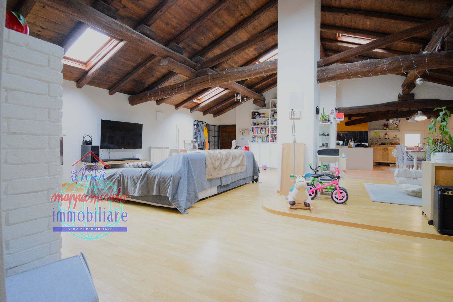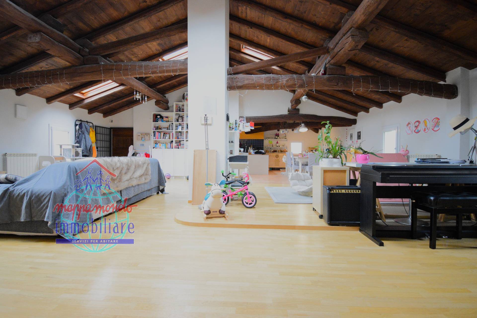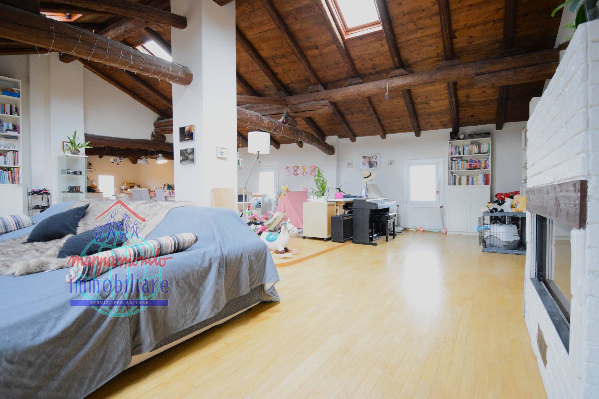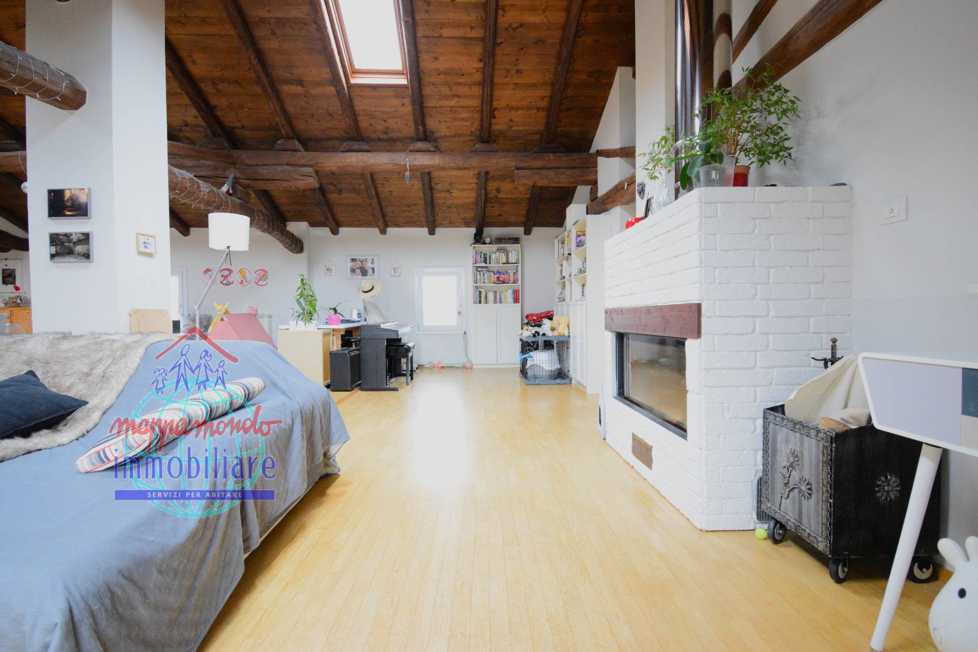 Ampio Loft con travi a vista, camino e parco privato a Bentivoglio (BO) In unoasi di pace e riservatezza, proponiamo in vendita una residenza unica nel suo genere: un ampio appartamento situato al piano secondo di una soluzione bifamiliare.
