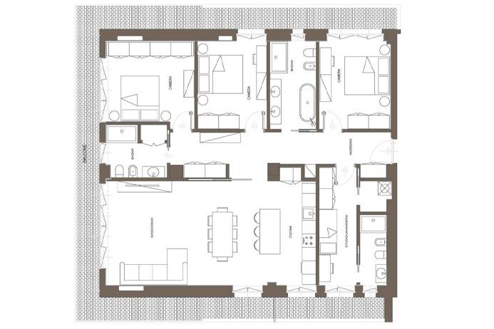 Internamente l'appartamento sar composto da ampio ingresso, ampio soggiorno con cucina open space con accesso alla terrazza, disimpegno, 3 ampie camere da letto matrimoniali con accesso alla terrazza, 2 bagni finestrati, quarta camera da letto o studio con accesso alla terrazza, terzo bagno finestrato e lavanderia.