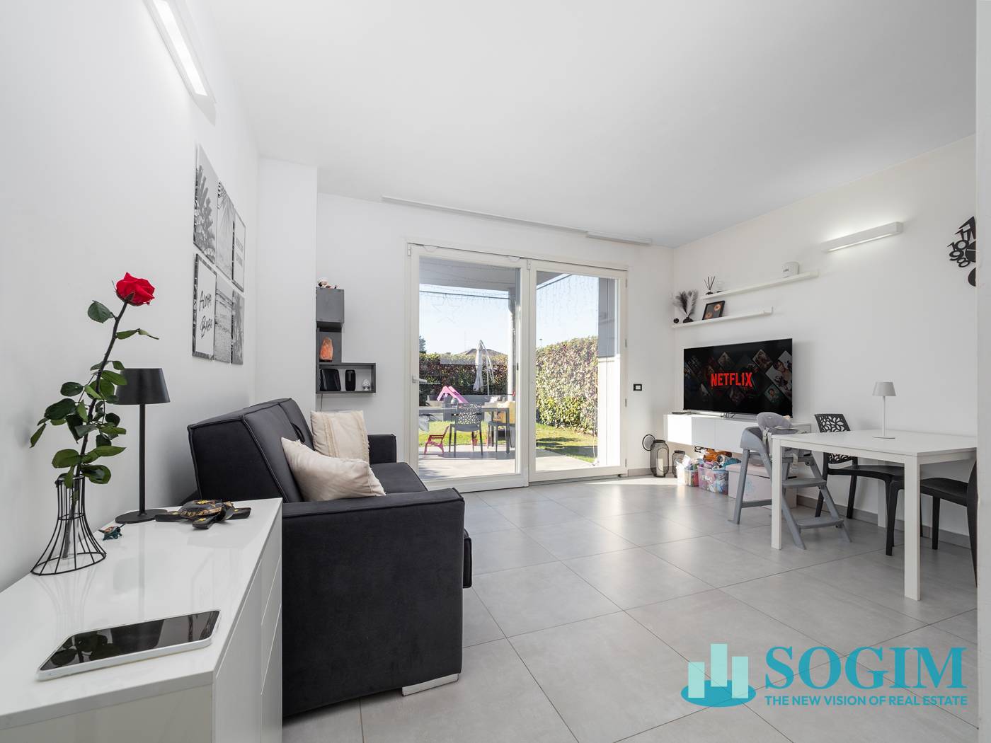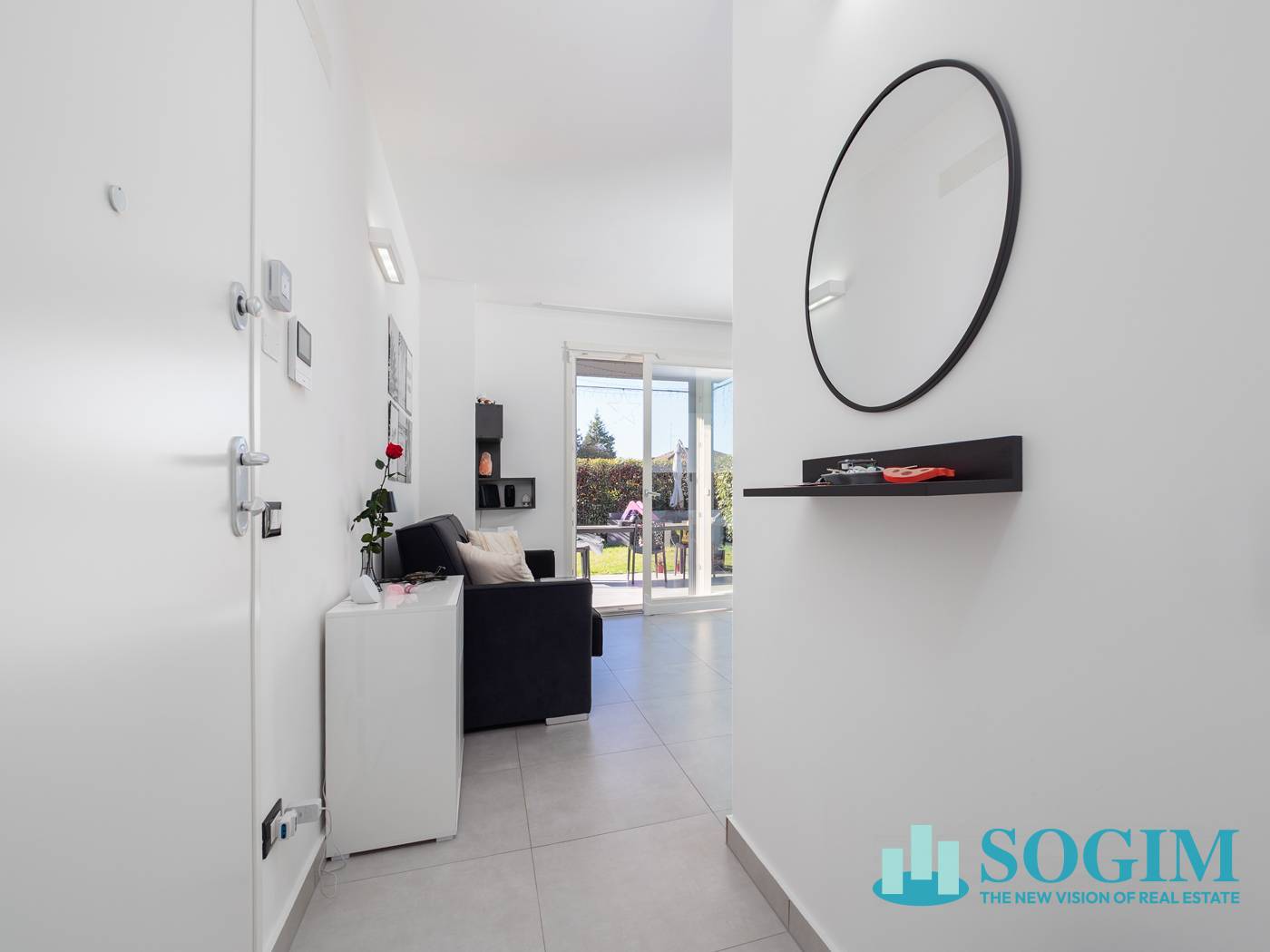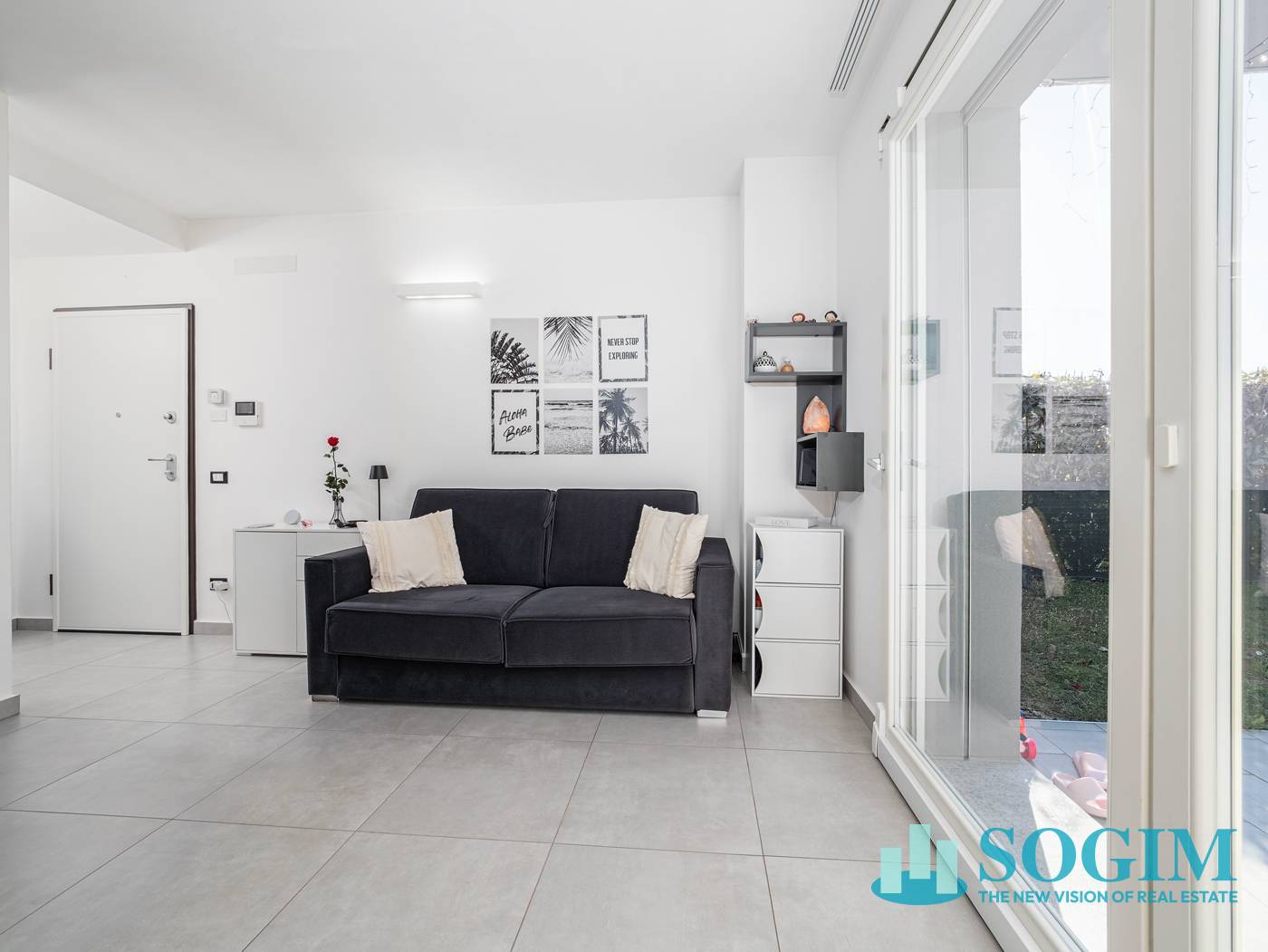 L'appartamento,libero su tre lati, gode di una doppia esposizione sud-ovest beneficiando di un apporto di luce naturale che dona una gradevole luminosit all'abitazione per buona parte della giornata ed composto dall'ingresso che si apre sul soggiorno con cucina a vista dal quale si accede comodamente al portico antistante l'ampio giardino che abbraccia l'intera unit . L'atrio d'ingresso conduce alla zona notte che accoglie un'ampia camera matrimoniale, il bagno e un locale destinato a lavanderia . La soluzione fornita di porte a battente con tonalit cromatiche neutre che persistono in tutta l'abitazione combinando modernit e linee semplici, infissi doppio vetro in PVC bianchi, porta blindata, videocitofono, predisposizione per impianto di climatizzazione . La tipologia di pavimentazione che connota questo grazioso bilocale costituendo il fil rouge di tutti gli ambienti il gres porcellanato in grigio chiaro . Completano l'immobile un vano cantina posto al piano primo sottostrada comodamente raggiungibile con l'ascensore ed un ampio box singolo . Il bilocale si colloca all'interno di un moderno contesto di abitazioni a schiera finemente realizzato.