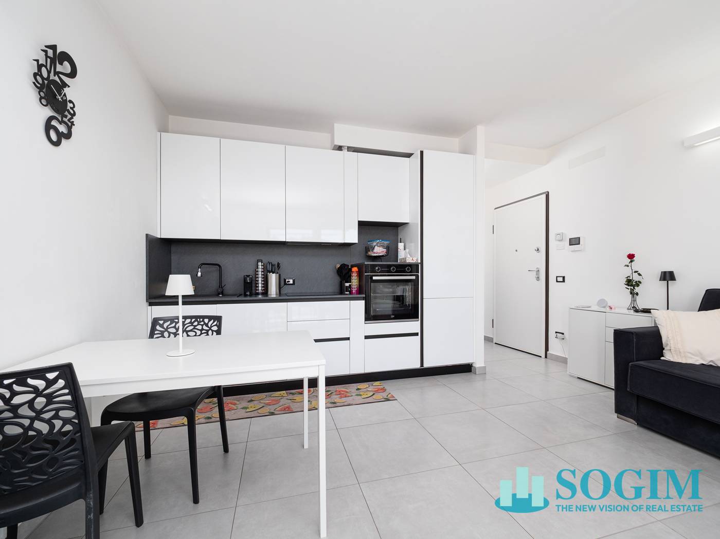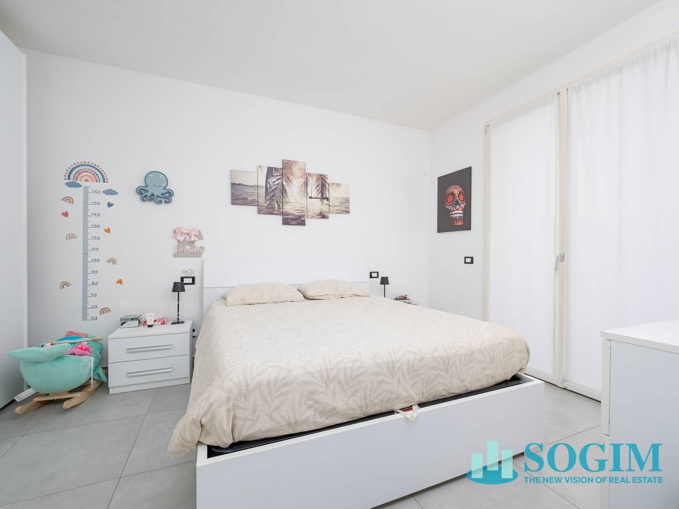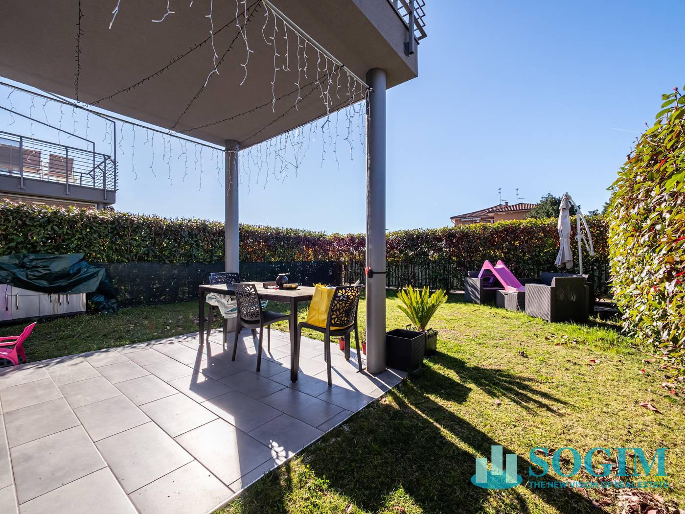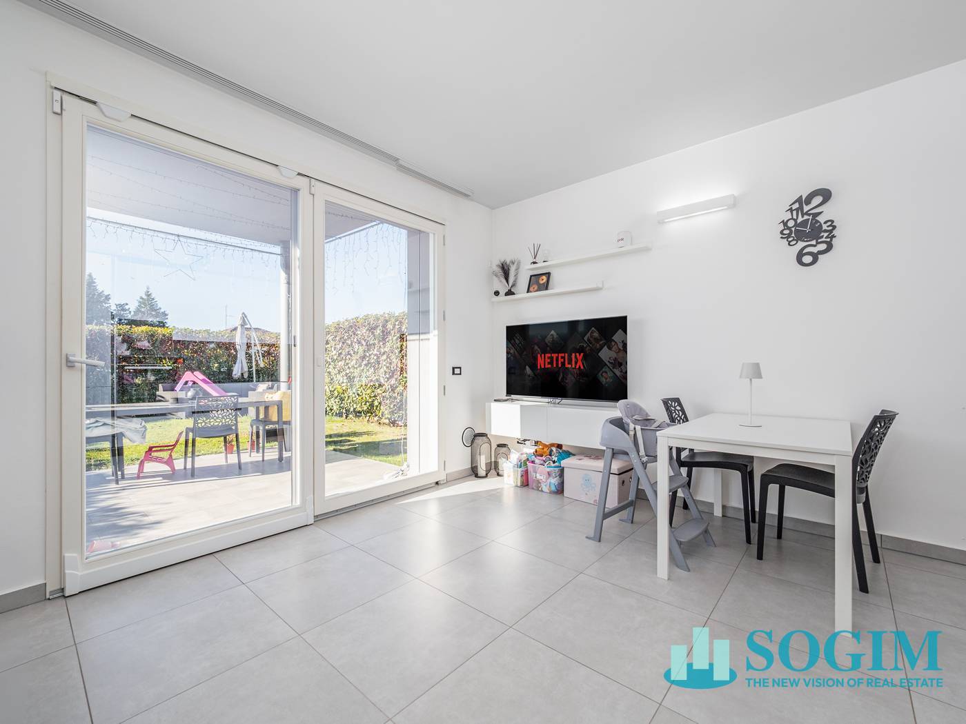 L'appartamento,libero su tre lati, gode di una doppia esposizione sud-ovest beneficiando di un apporto di luce naturale che dona una gradevole luminosit all'abitazione per buona parte della giornata ed composto dall'ingresso che si apre sul soggiorno con cucina a vista dal quale si accede comodamente al portico antistante l'ampio giardino che abbraccia l'intera unit . L'atrio d'ingresso conduce alla zona notte che accoglie un'ampia camera matrimoniale, il bagno e un locale destinato a lavanderia . La soluzione fornita di porte a battente con tonalit cromatiche neutre che persistono in tutta l'abitazione combinando modernit e linee semplici, infissi doppio vetro in PVC bianchi, porta blindata, videocitofono, predisposizione per impianto di climatizzazione . La tipologia di pavimentazione che connota questo grazioso bilocale costituendo il fil rouge di tutti gli ambienti il gres porcellanato in grigio chiaro . Completano l'immobile un vano cantina posto al piano primo sottostrada comodamente raggiungibile con l'ascensore ed un ampio box singolo . Il bilocale si colloca all'interno di un moderno contesto di abitazioni a schiera finemente realizzato.