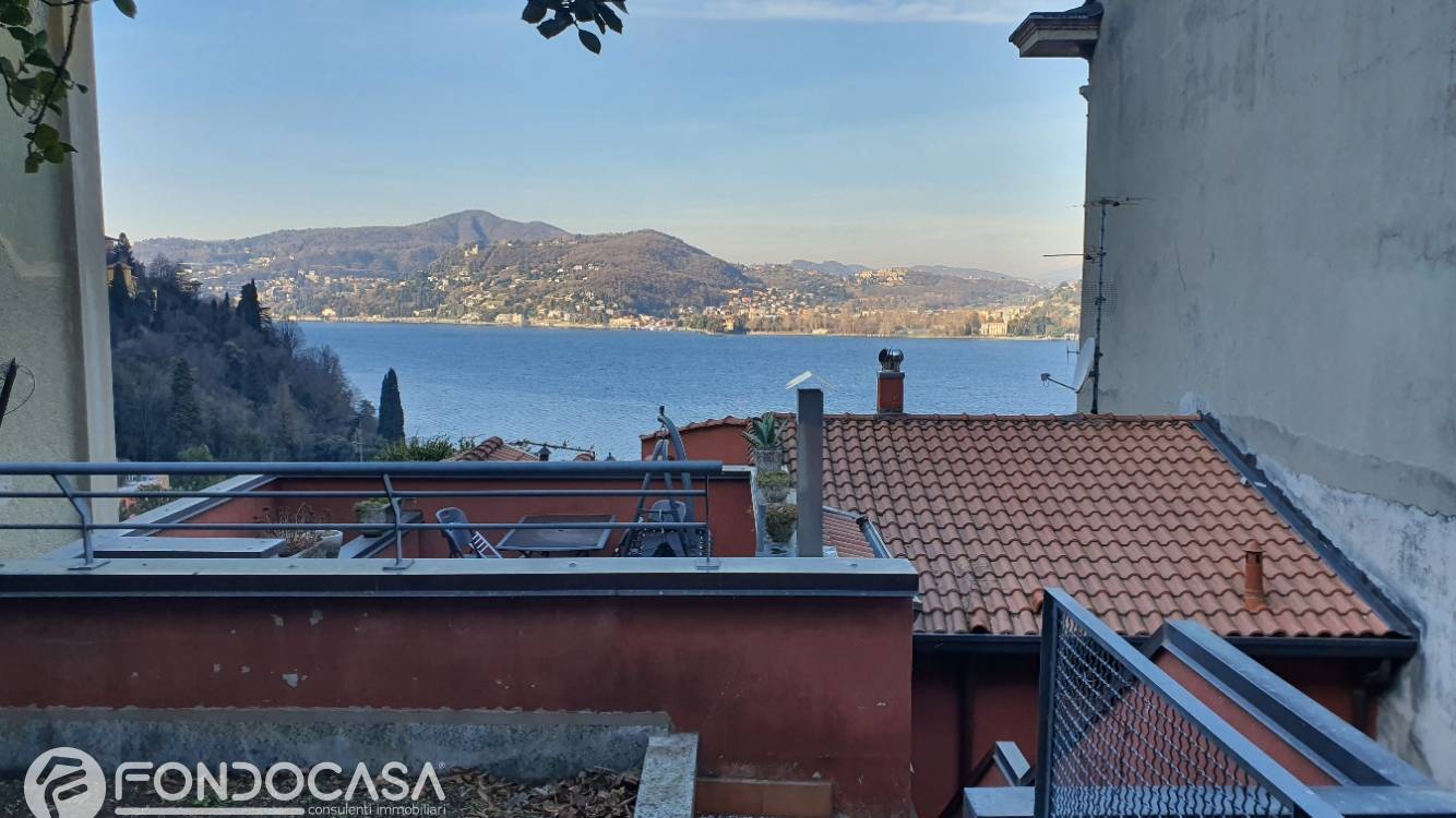 APPARTAMENTO ATTICO, con travi a vista, soggiorno con camino , cucina, due camere, due bagni, terrazzo con stupenda vista lago, giardino privato con locale hobby, cantina.