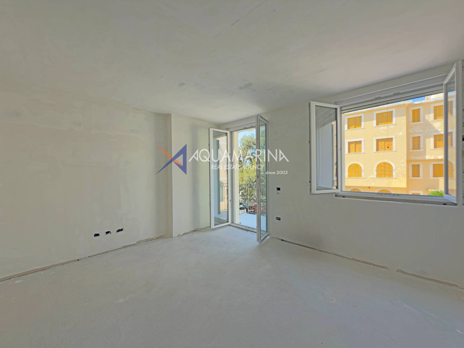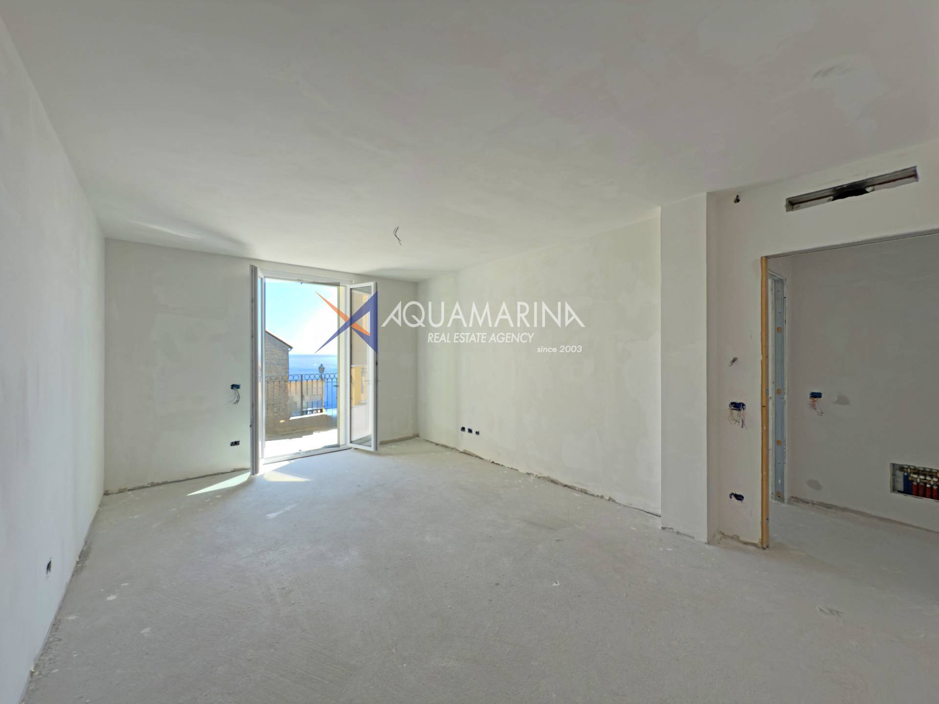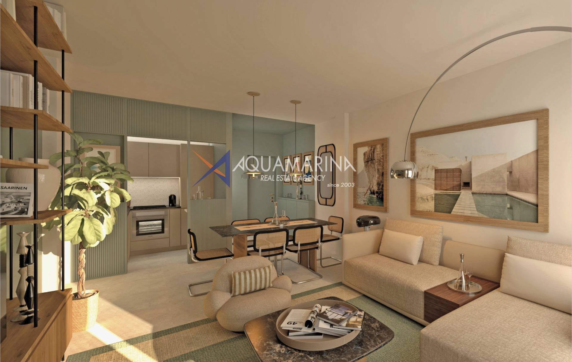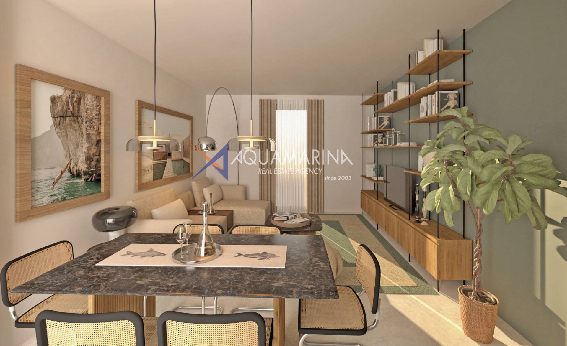 L'appartamento composto da un'ampia zona giorno con cucina a vista, disimpegno, due camere da letto, due bagni, balcone e terrazzo per rilassarsi all'aria aperta.
