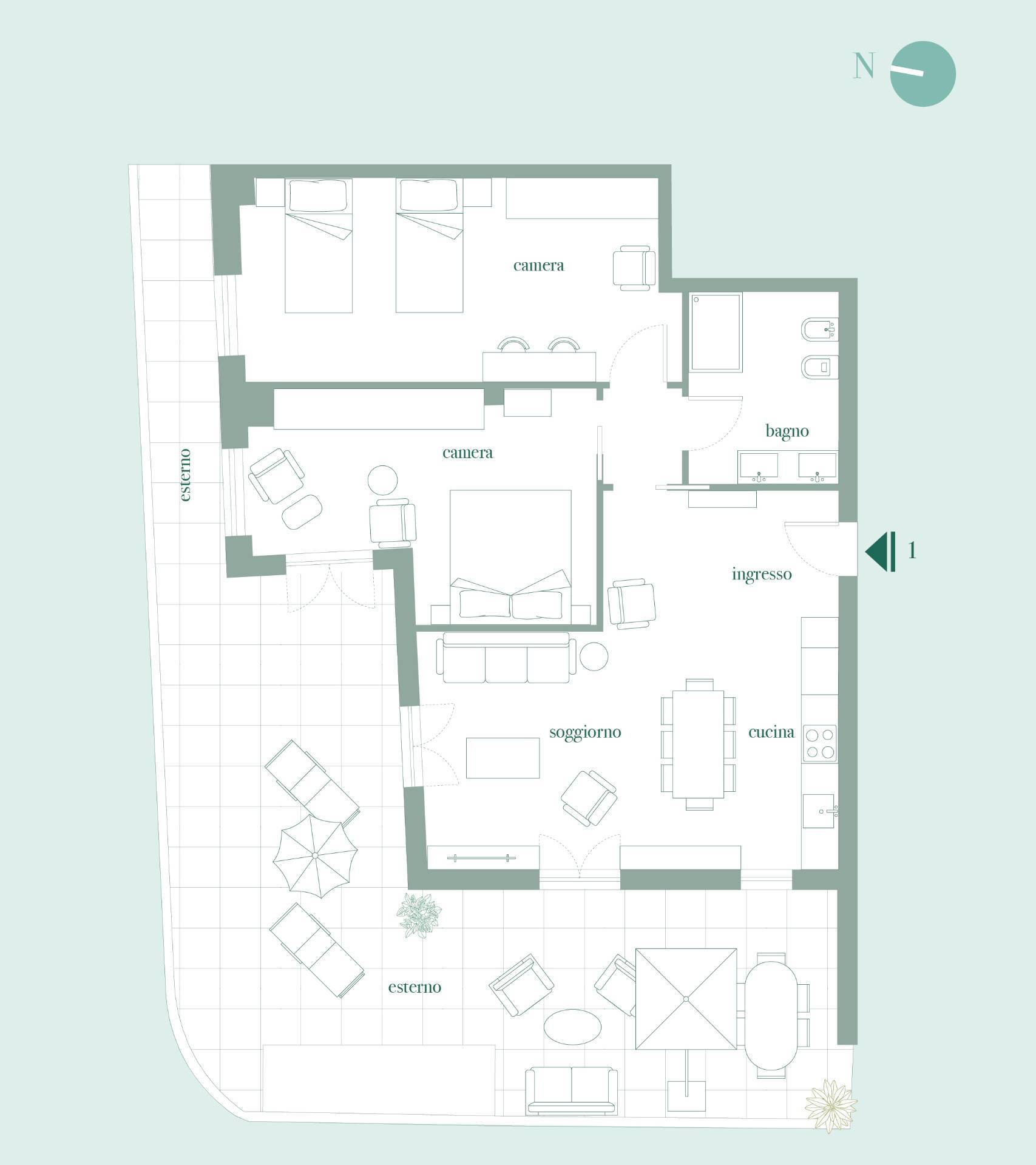 Caratteristiche principali: Superficie interna: 84 m Balcone abitabile: 38 m Stato: nuovo Classe energetica A Edificio privo di barriere architettoniche L'Appartamento composto da un ampio soggiorno con angolo cottura, due camere, bagno e terrazzo.