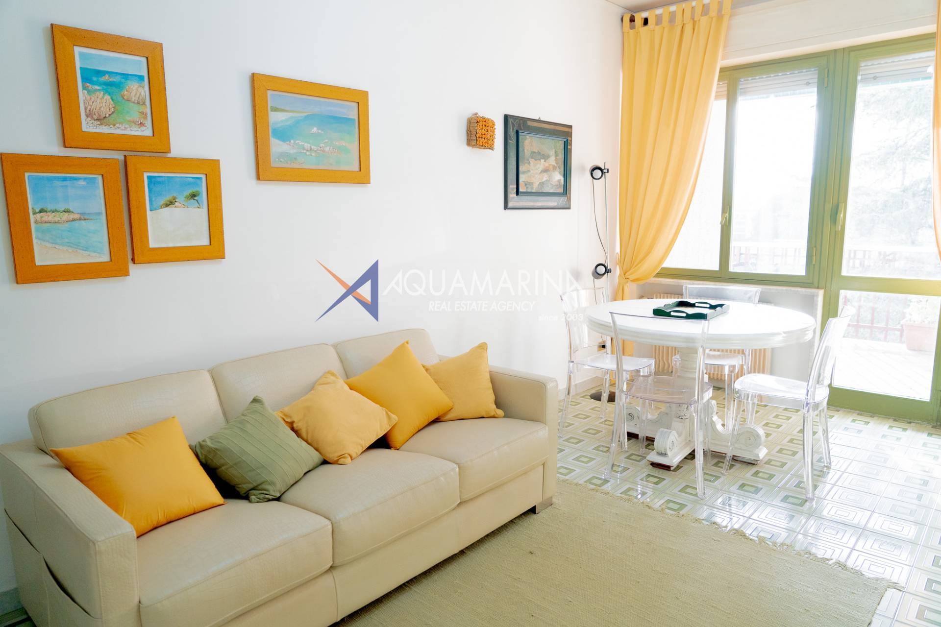 Dal soggiorno si accede al terrazzo, parzialmente coperto e dotato di tenda parasole, adatto per godersi momenti di relax o per organizzare pranzi o cene allaperto.