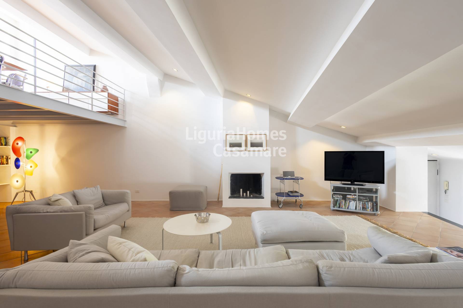 Il livello superiore offre una sala da pranzo sospesa che si affaccia sul salone, un terzo bagno, una lavanderia, una cucina indipendente e una magnifica terrazza esposta a sud con vista panoramica sul mare e sui tetti del borgo storico.