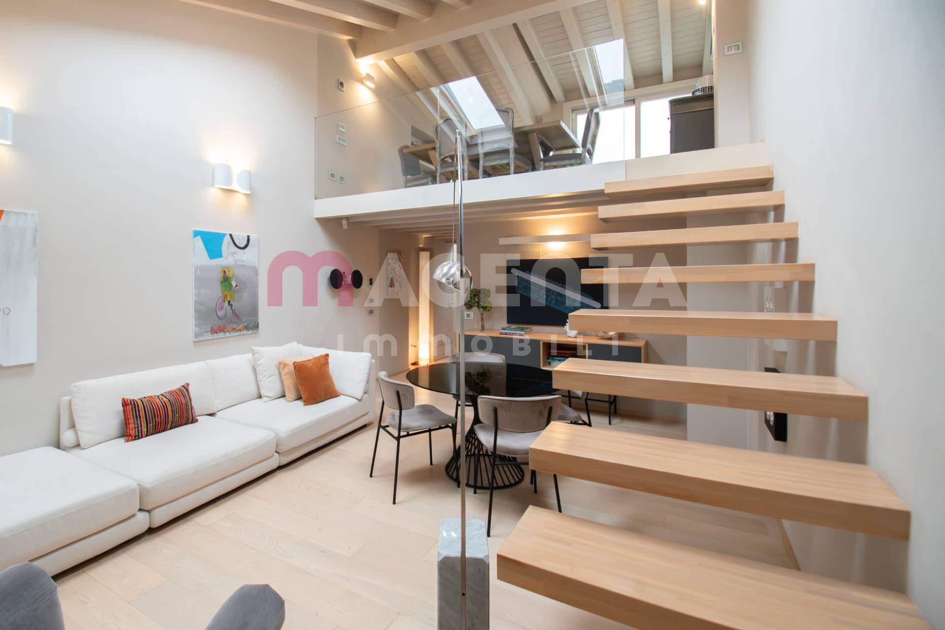 La soluzione si sviluppa su due livelli oltre a un suggestivo soppalco a vista che affaccia sulla zona giorno.