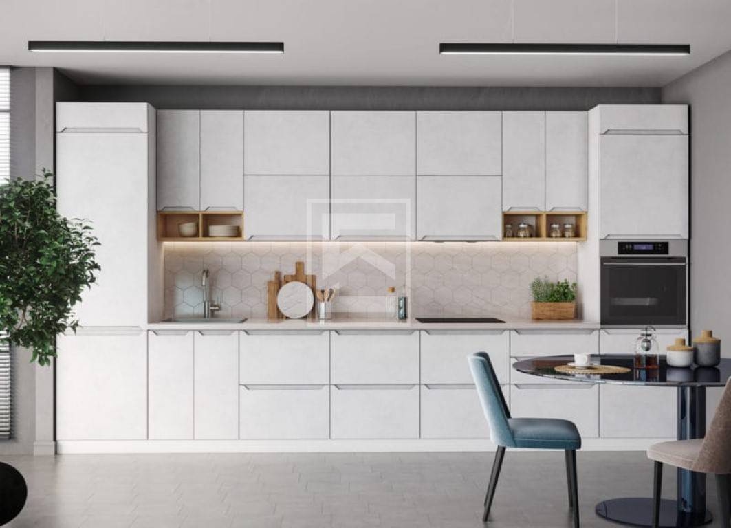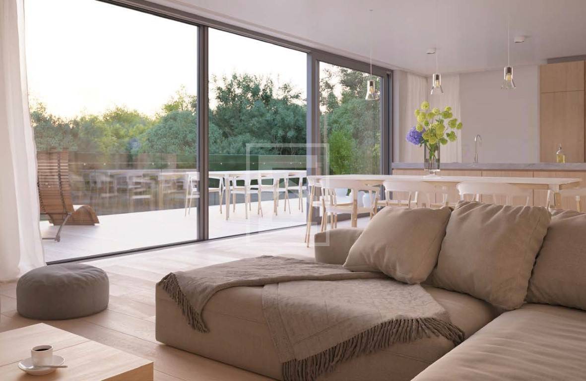 Lingresso si apre su un ampio e luminoso soggiorno con cucina a vista e zona pranzo.