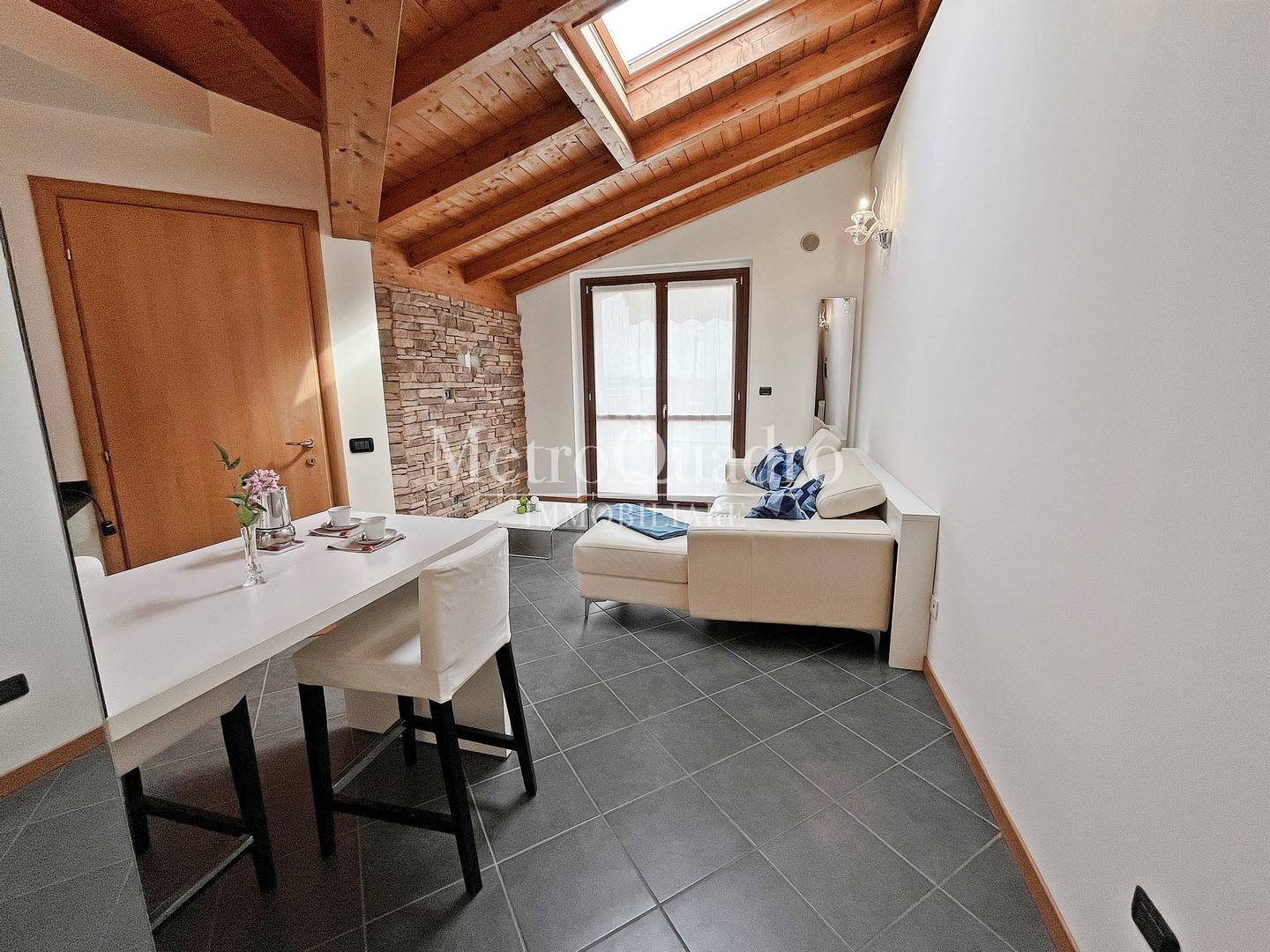 L'appartamento posto all'ultimo piano con ascensore, sviluppa una superficie di 60 mq. Tramite la porta blindata accediamo al funzionale locale openspace di soggiorno e cucina, dove l'ambiente ben distribuito, presenta inizialmente la zona cottura gi arredata e completa di elettrodomestici e tavolo a penisola, successivamente la zona living con divano e parete Tv con gradevole effetto pietra, il locale termina con l'accesso al terrazzino di buona superficie dove trova alloggio la caldaia autonoma gi incassata nella parete esterna.