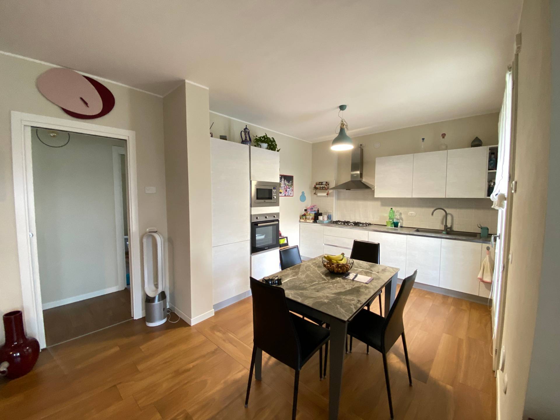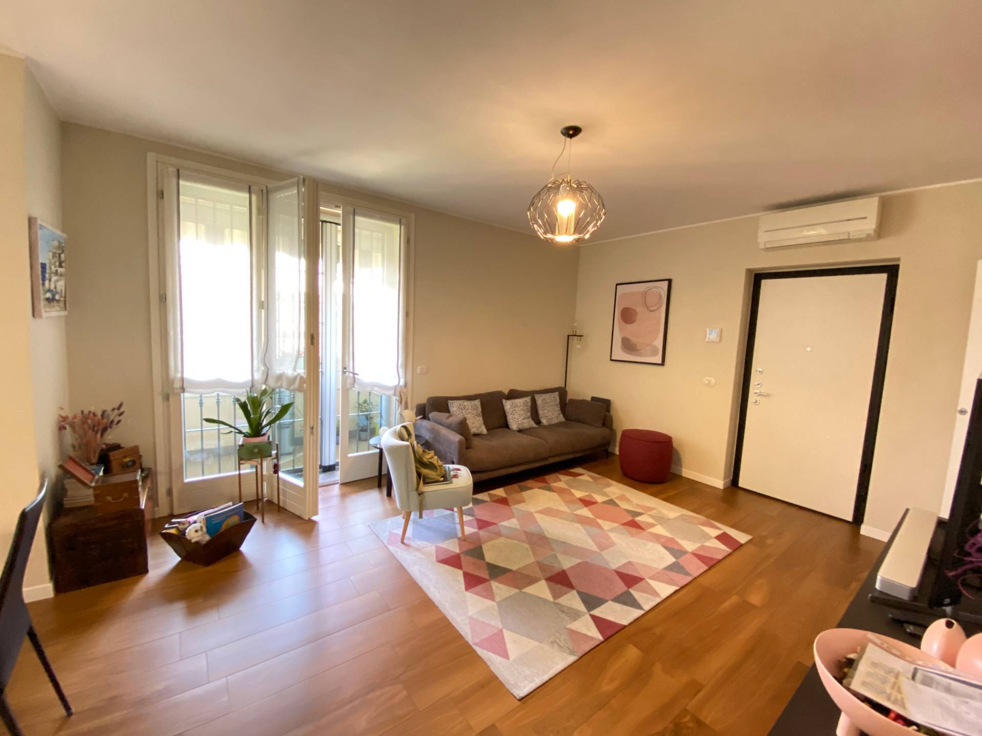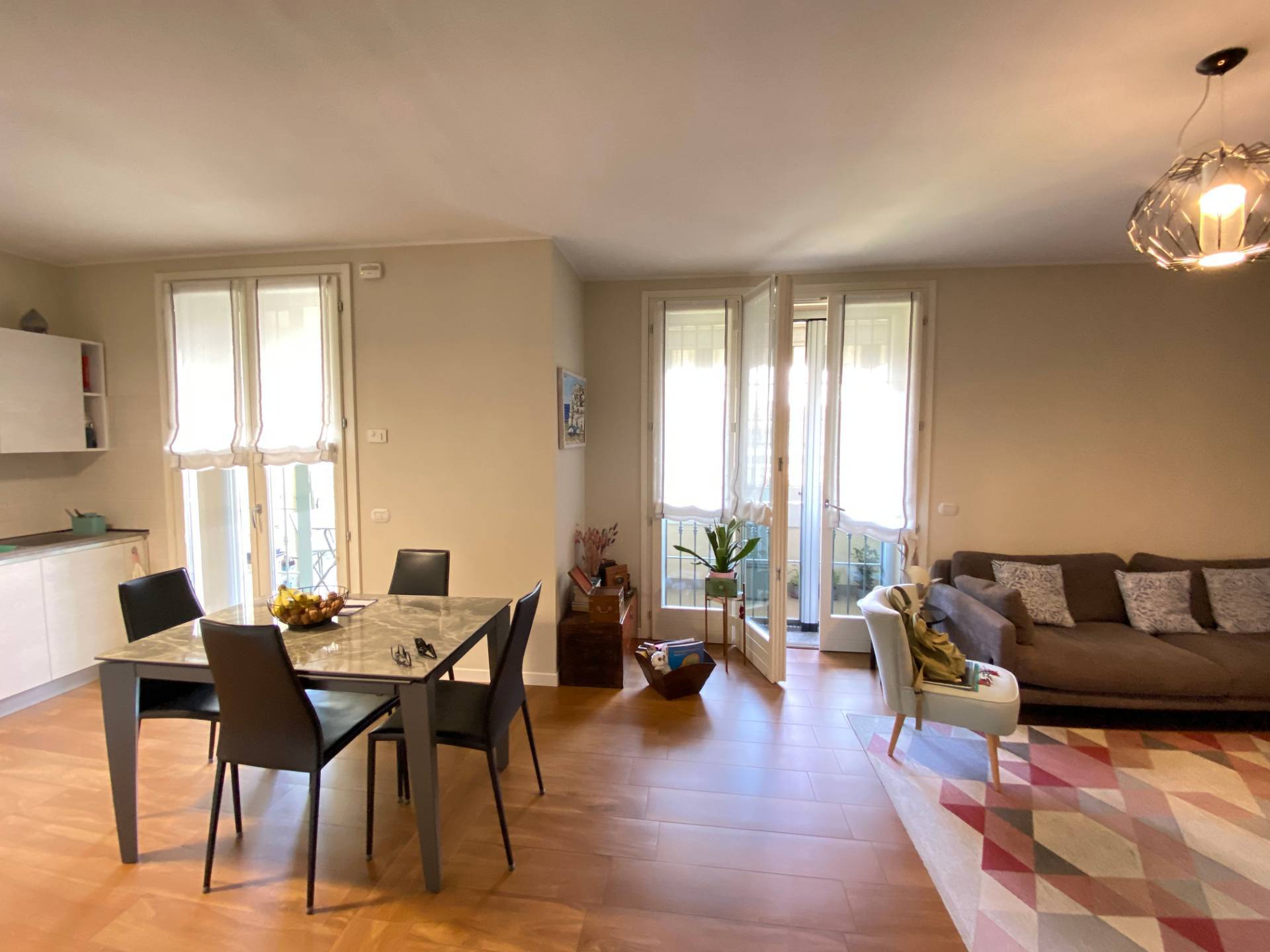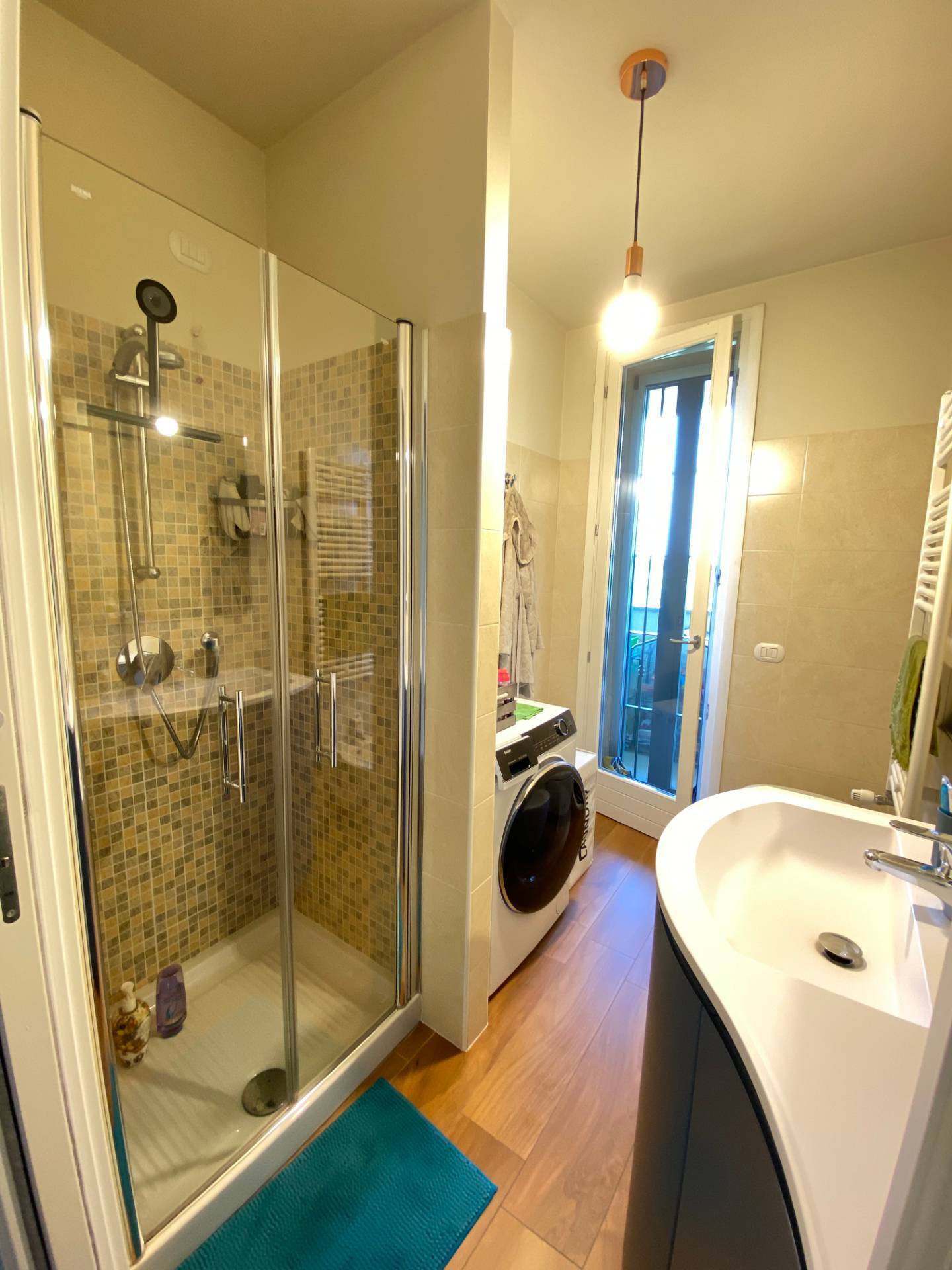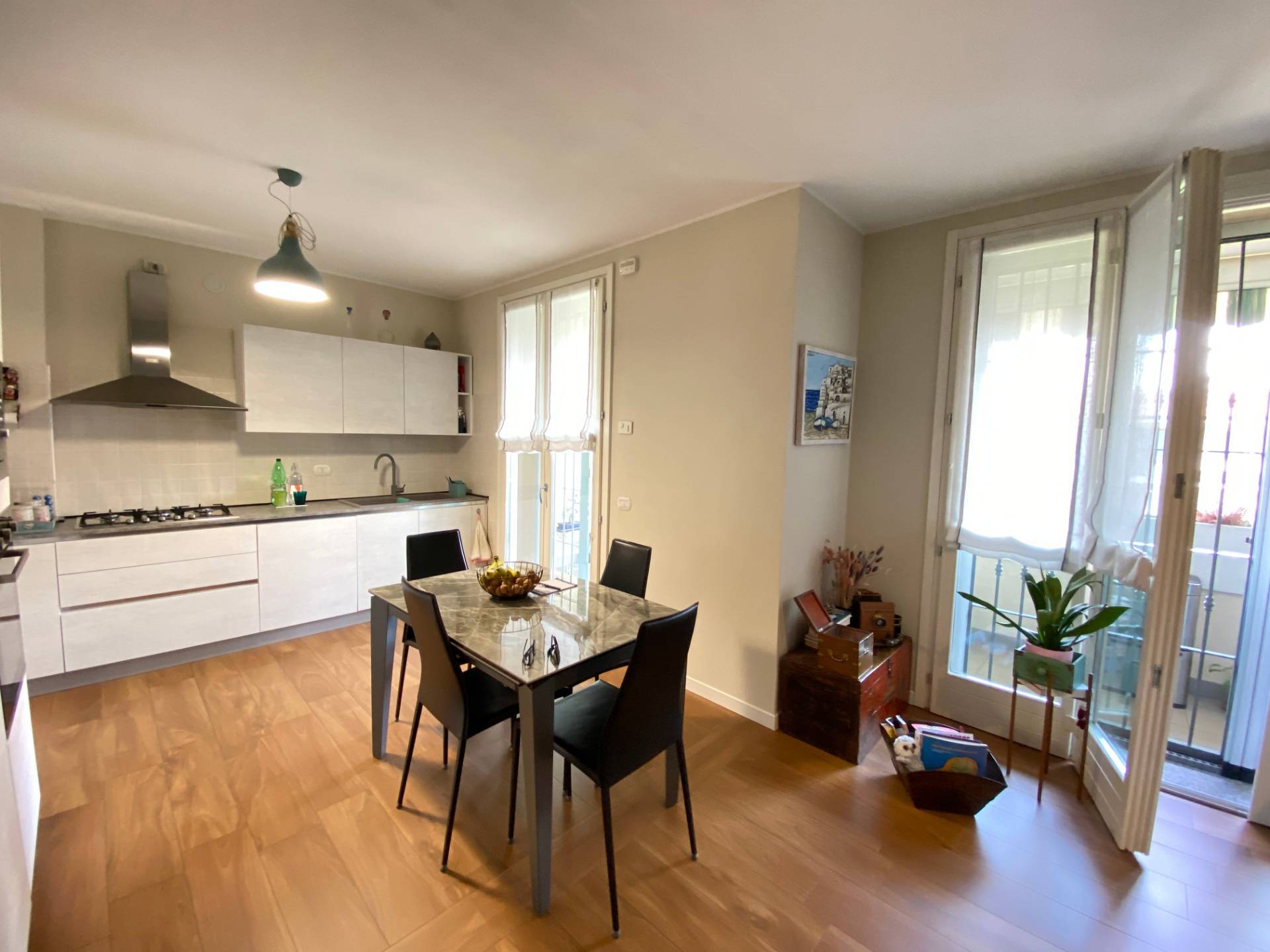 Posto al piano ultimo con ascensore, composto da ingresso in sala con cucina (resa a vista per scelta estetica), disimpegno notte, due bagni (entrambi finestrati e completi) due camere da letto, ampi terrazzi, cantina e box autorimessa.