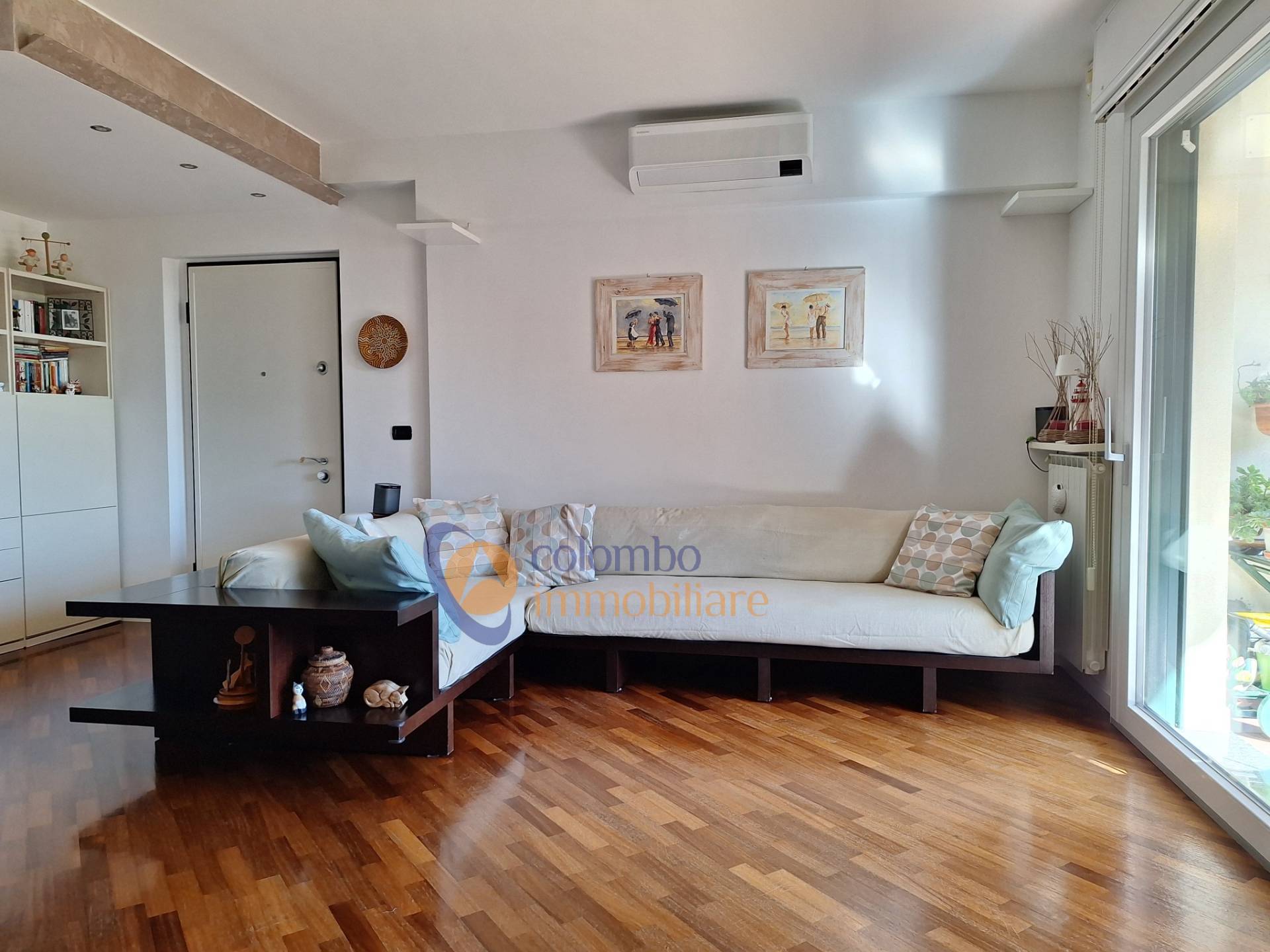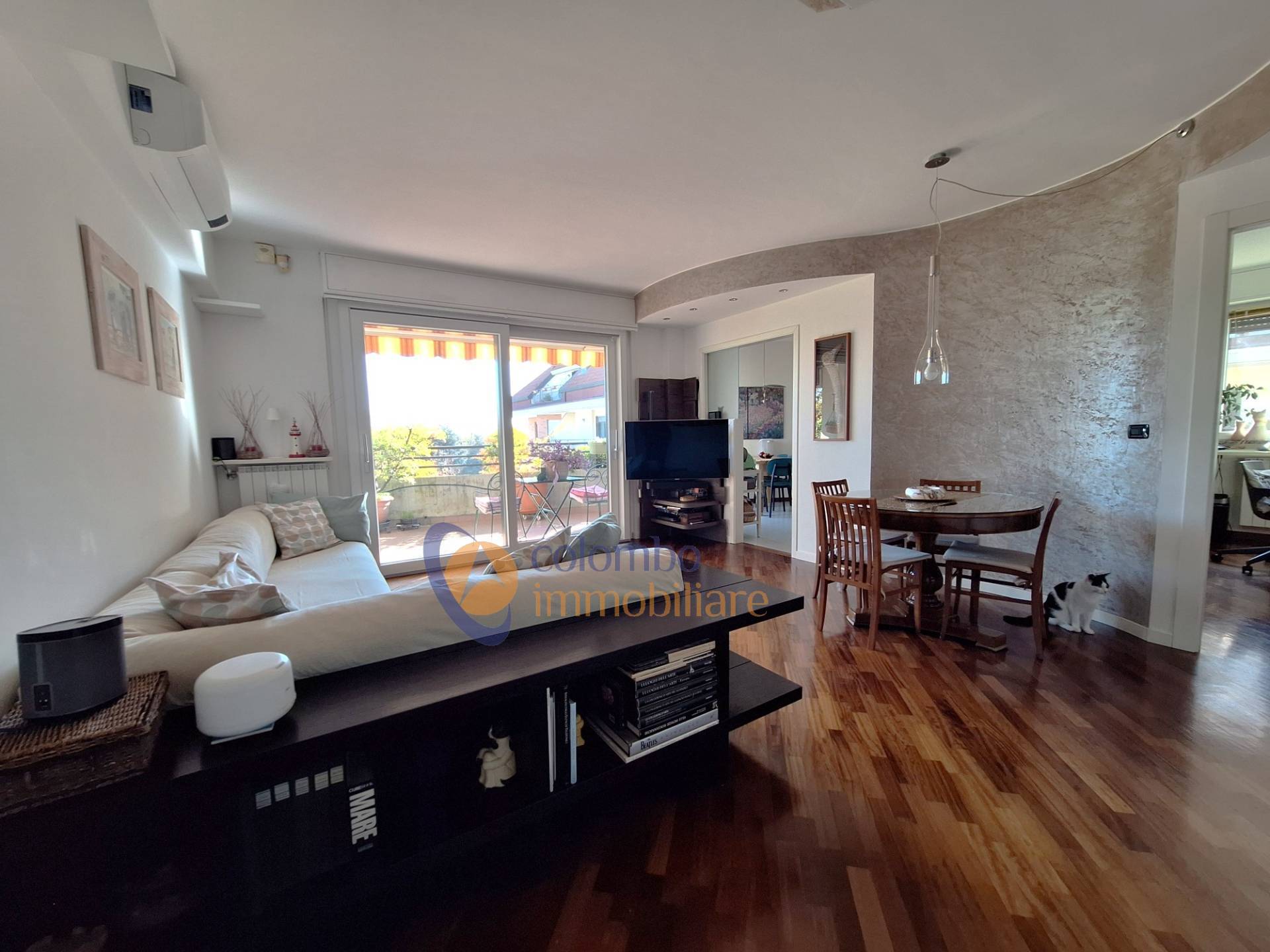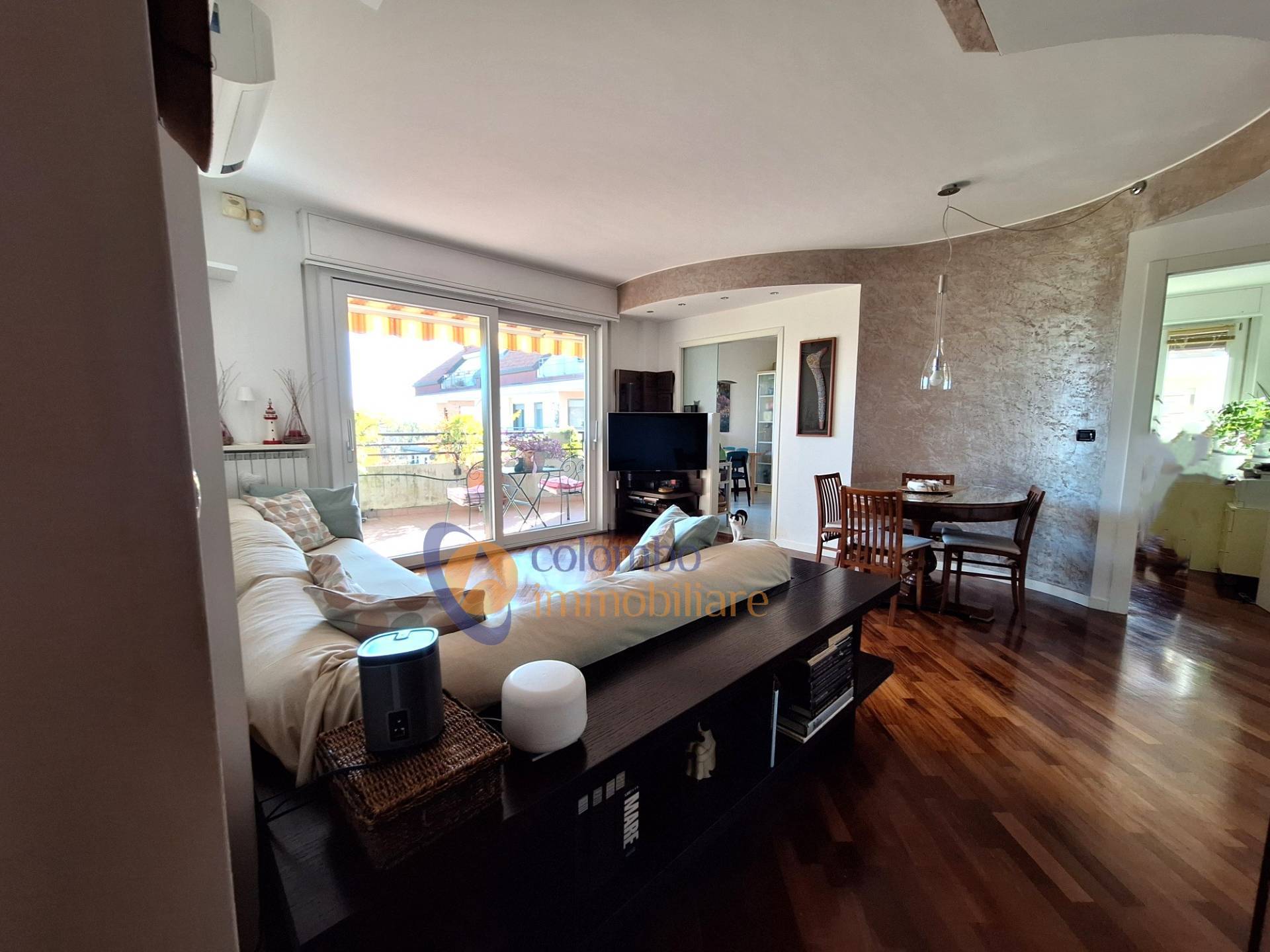 L'appartamento, tutto pavimentato in parquet, composto da un soggiorno con terrazzo, una cucina veramente abitabile anch'essa con uscita sul terrazzo, tre camere di cui una adibita a studio, e doppi servizi di cui uno con doccia e l'altro con vasca.