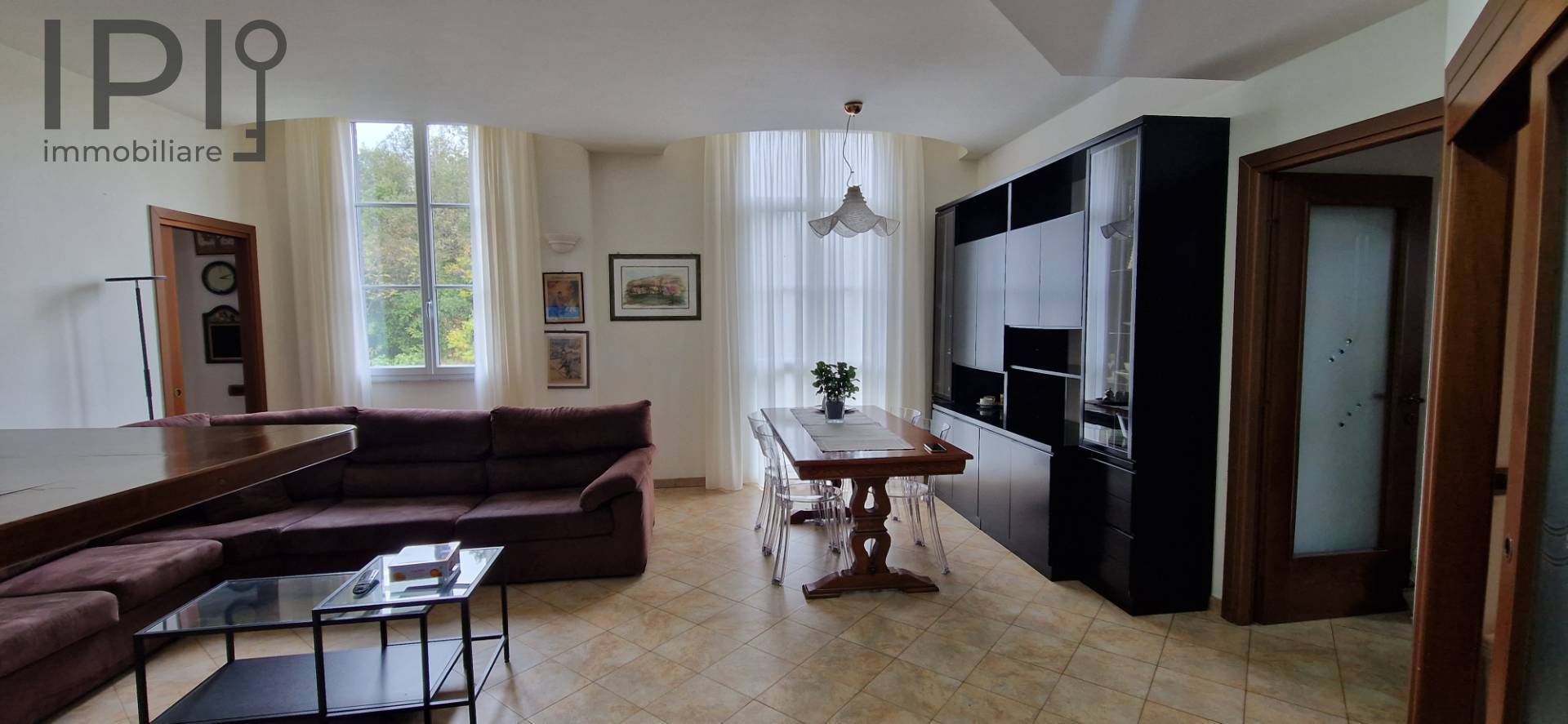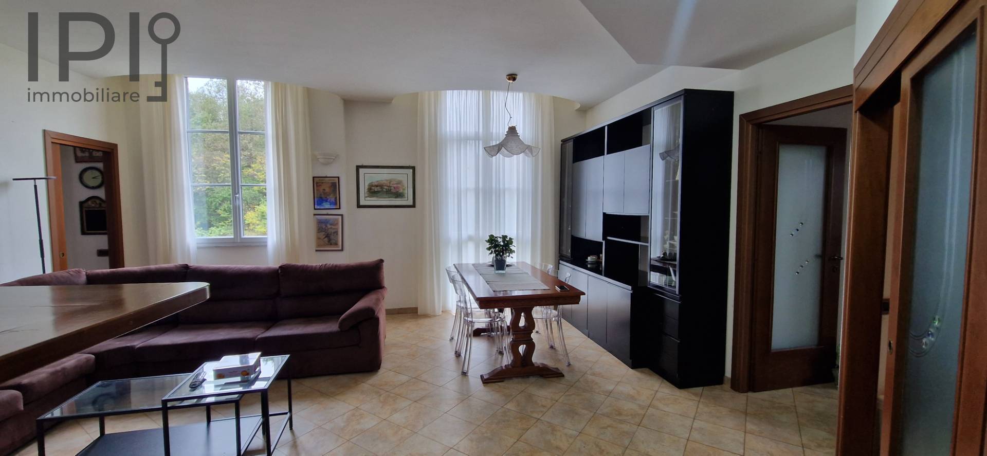 Dalla zona living si accede alla cucina abitabile con balcone e ad un angolo studio separato da porte scorrevoli in legno e vetro decorato.