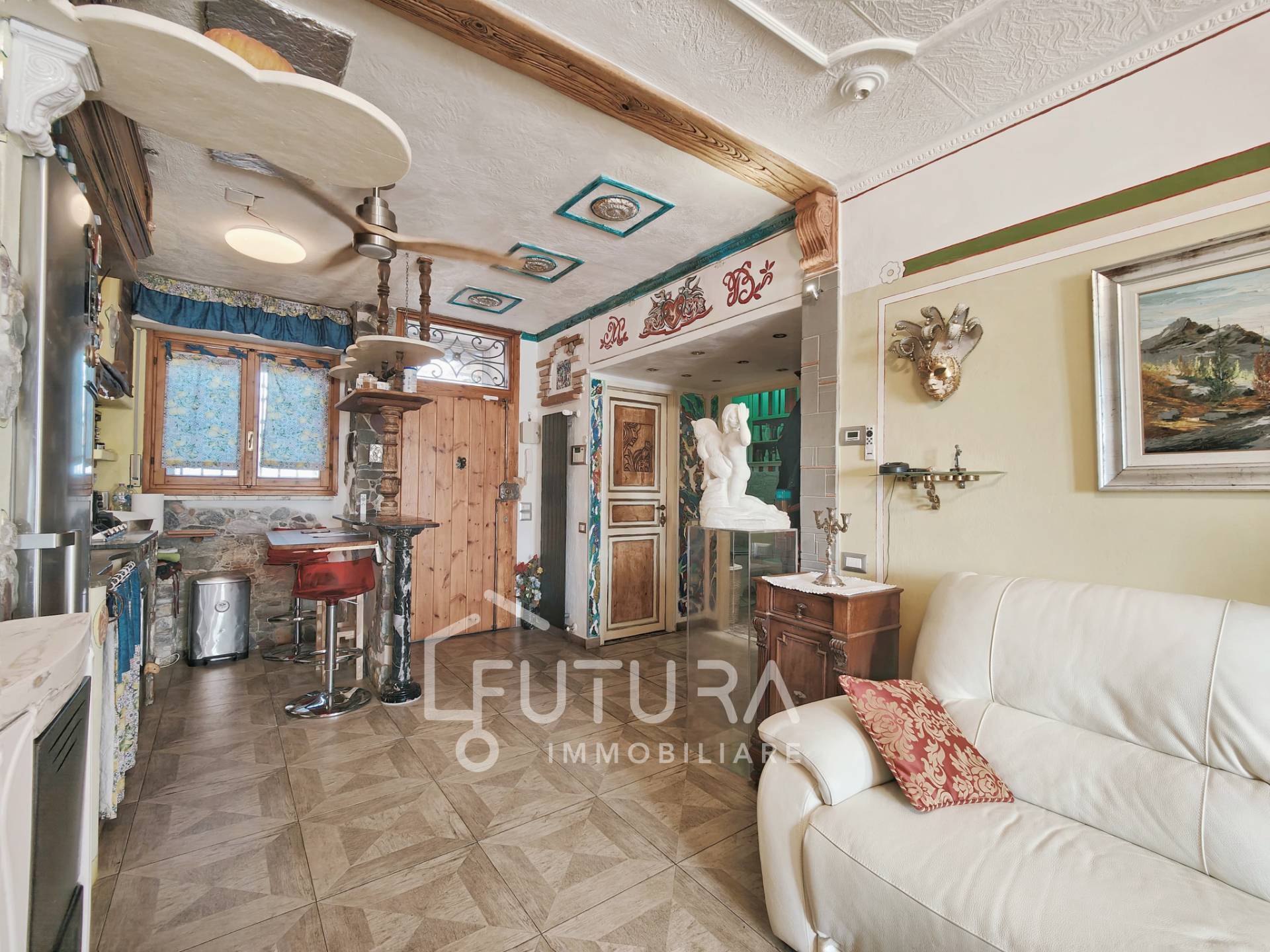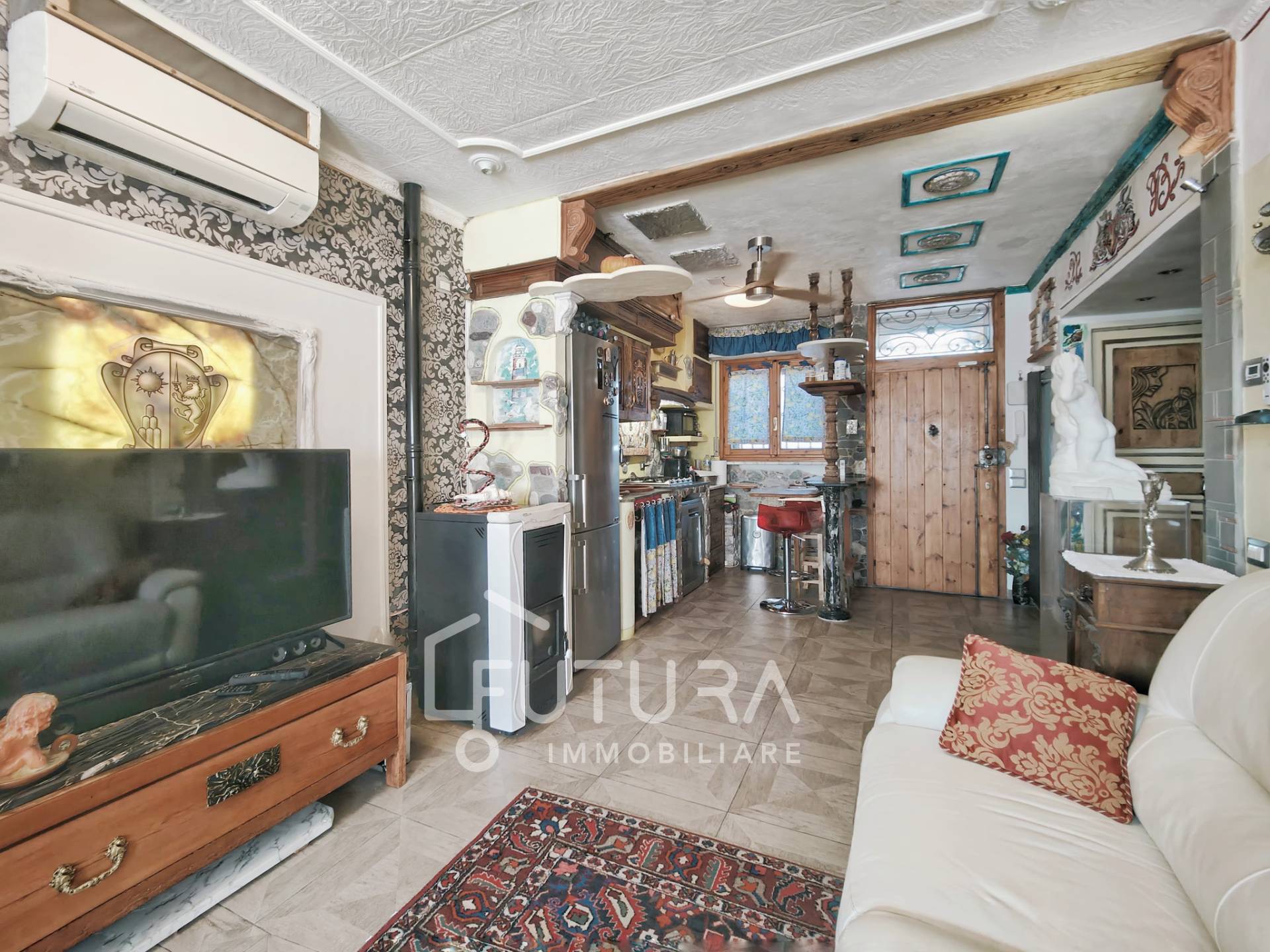 Completo di condizionatori e stufa a pellet (in supporto al riscaldamento autonomo a metano), ha beneficiato anche di una ristrutturazione del tetto nel 2024. Questo appartamento ideale per chi cerca un'abitazione dal carattere tipico dato dalle molteplici rifiniture artigianali, che combinano vari materiali tra legno, pietre e marmi.