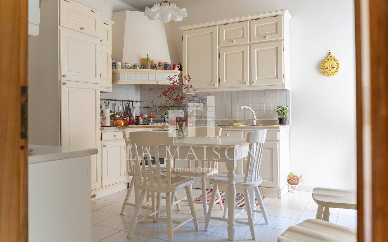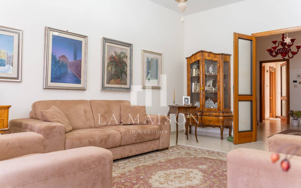 L'immobile, in ottime condizioni, si caratterizza per un doppio ingresso di particolare signorilit, ampia sala luminosa con balcone, cucina abitabile con balcone, soggiorno dotato anch'esso di balcone, tre camere da letto di generose dimensioni e ottima luminosit, oltre a due bagni.