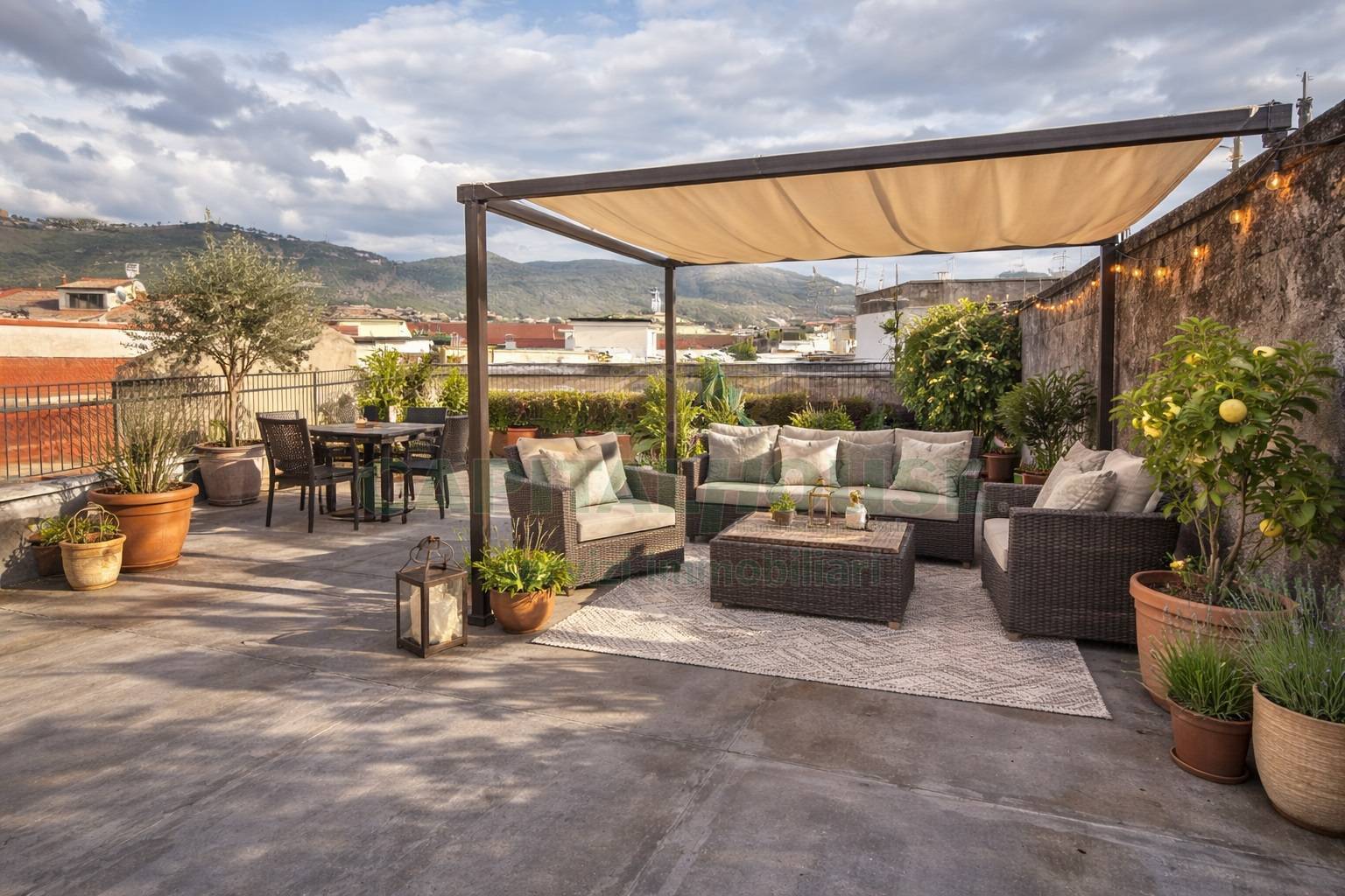 Allestire una zona solarium e relax con divanetti e piante ornamentali.