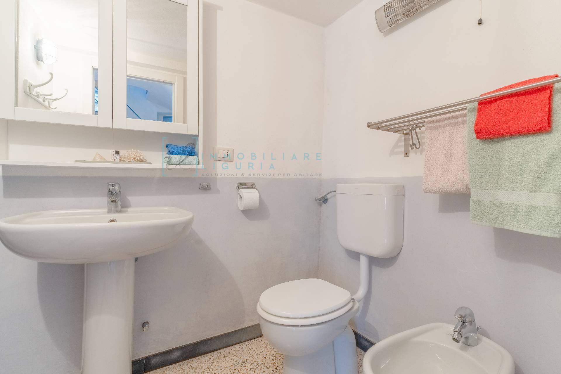 Tutti gli ambienti sono dotati di riscaldamento a pavimento.. Per le finiture interne sono stati scelti materiali preziosi: pavimentazione con "ciappe" liguri in terrazzo, battiscopa in pietra, rivestimenti delle scale e davanzali in pietra.