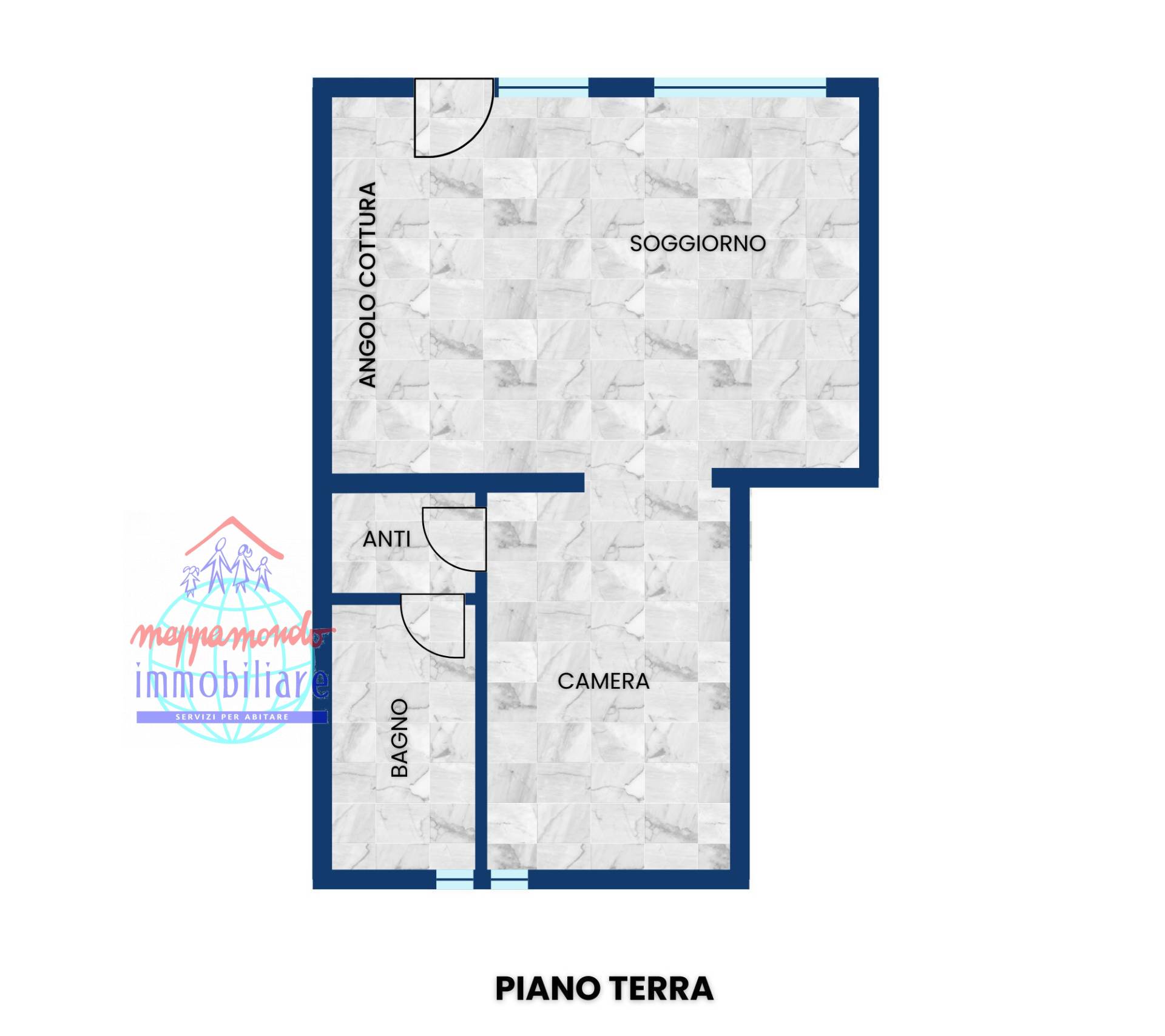 Gli spazi interni: Soggiorno con angolo cottura a vista; Camera da letto matrimoniale divisa; Bagno con box doccia.