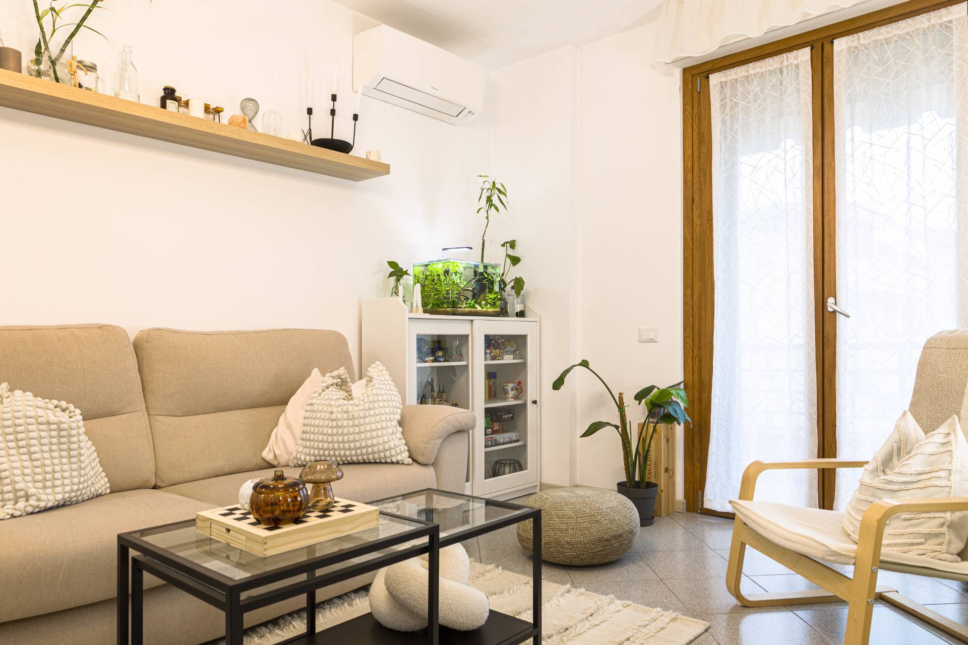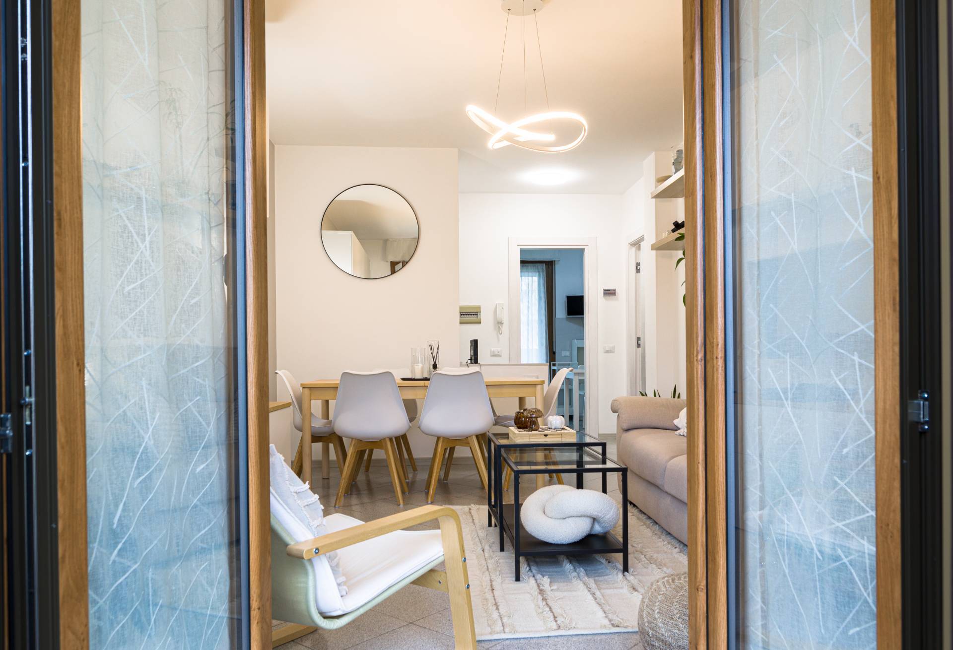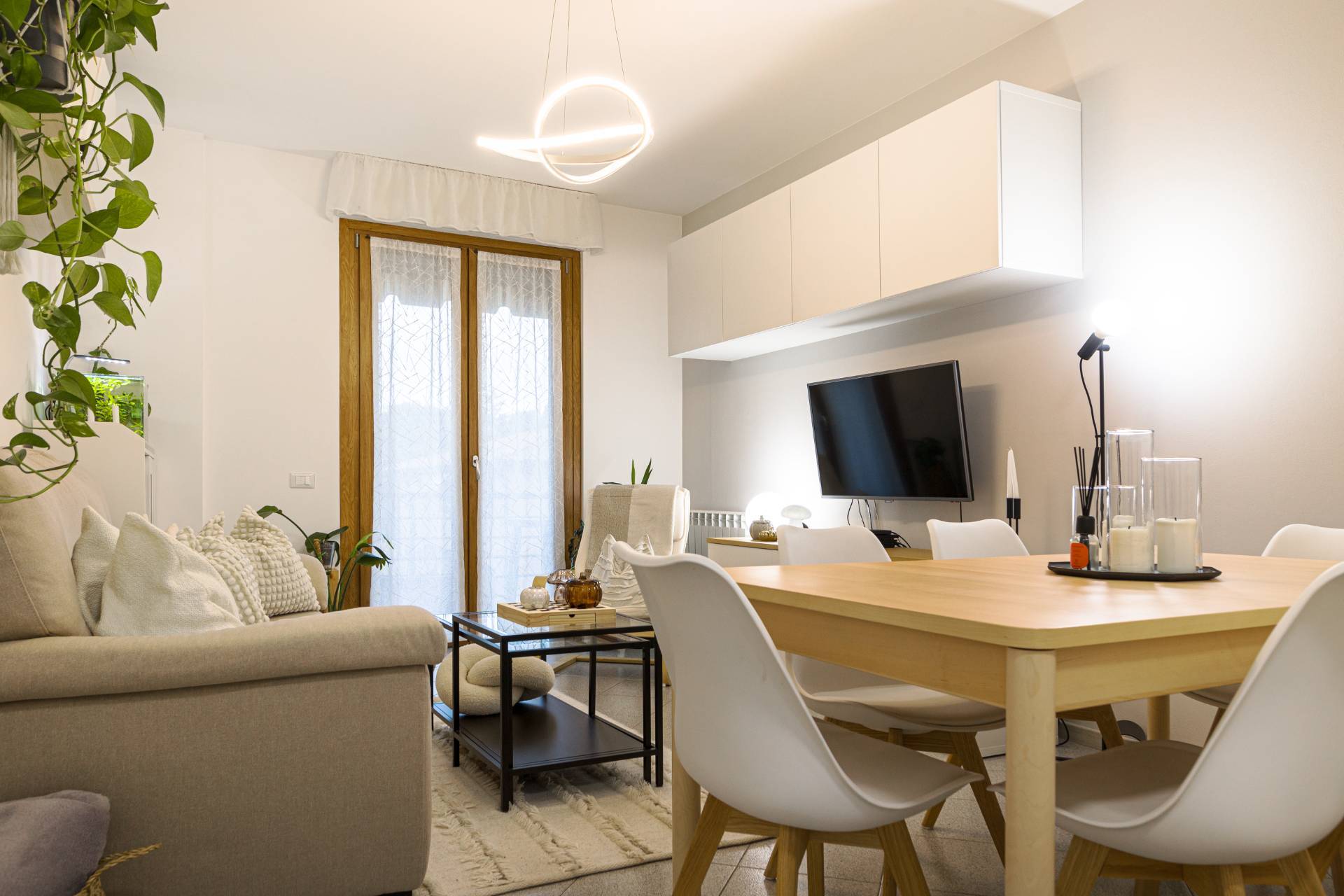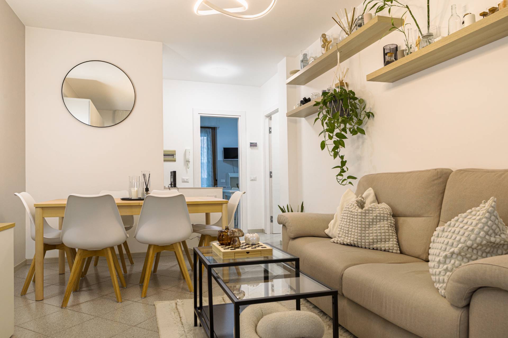 Appena varcato il portone si viene immediatamente colpiti dal calore degli ambienti e la sensazione che si prova quella si sentirsi subito a casa. Il luminoso soggiorno ben arredato ci obbliga ad immaginarci seduti per un bel pranzo in famiglia o con gli amici o sul divano a rilassarci davanti ad un film o a un videogioco.