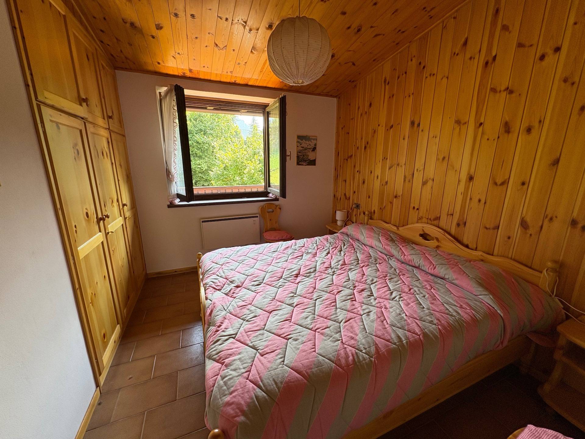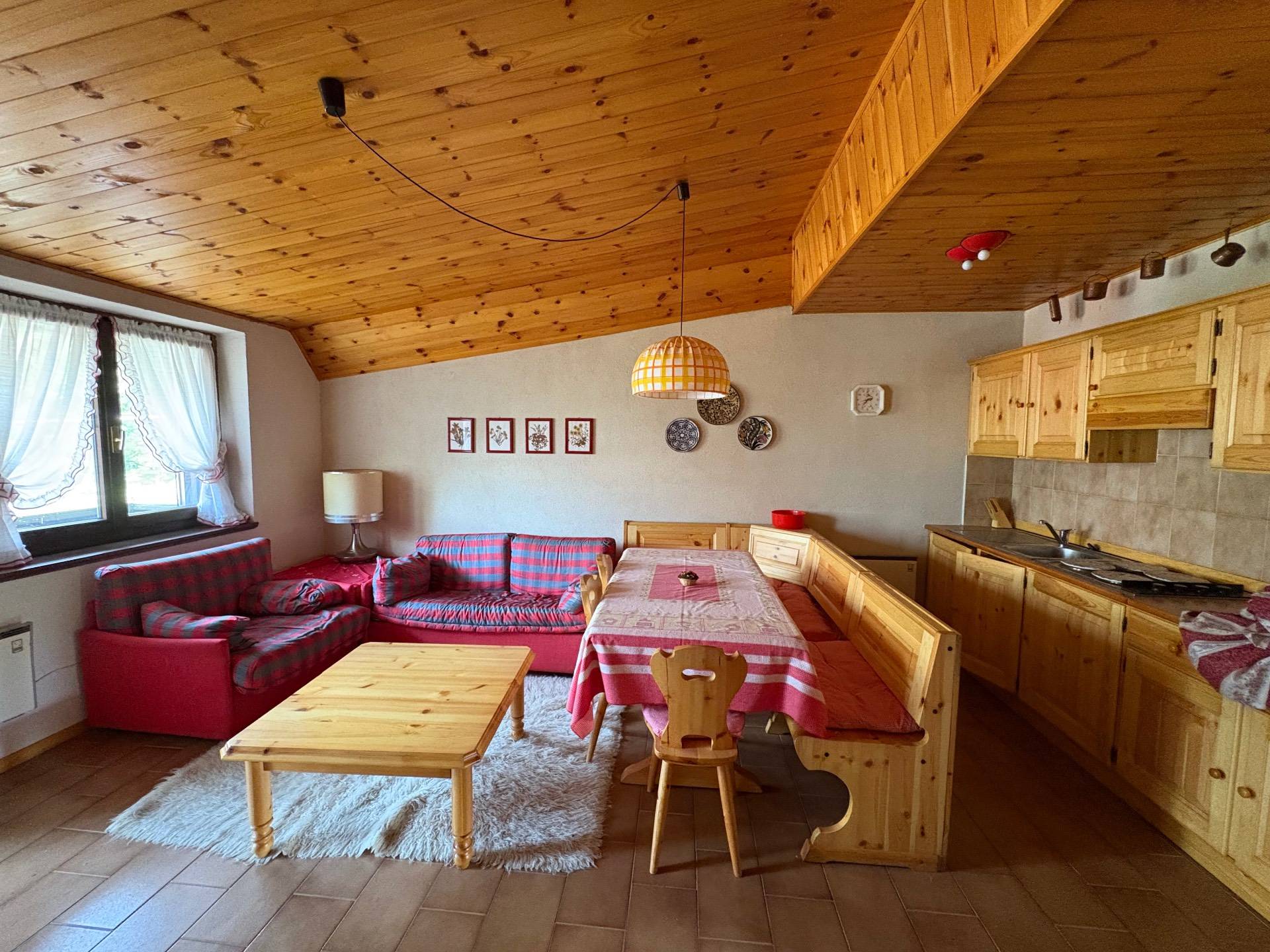 Labitazione, dallo stile tipicamente montano, caldo e avvolgente, si trova al secondo piano ed libera su due lati. Varcando la soglia si viene accolti da un luminoso soggiorno, uno spazio dove la cucina a vista si integra perfettamente con lambiente living, dove troviamo il caratteristico camino a legna.