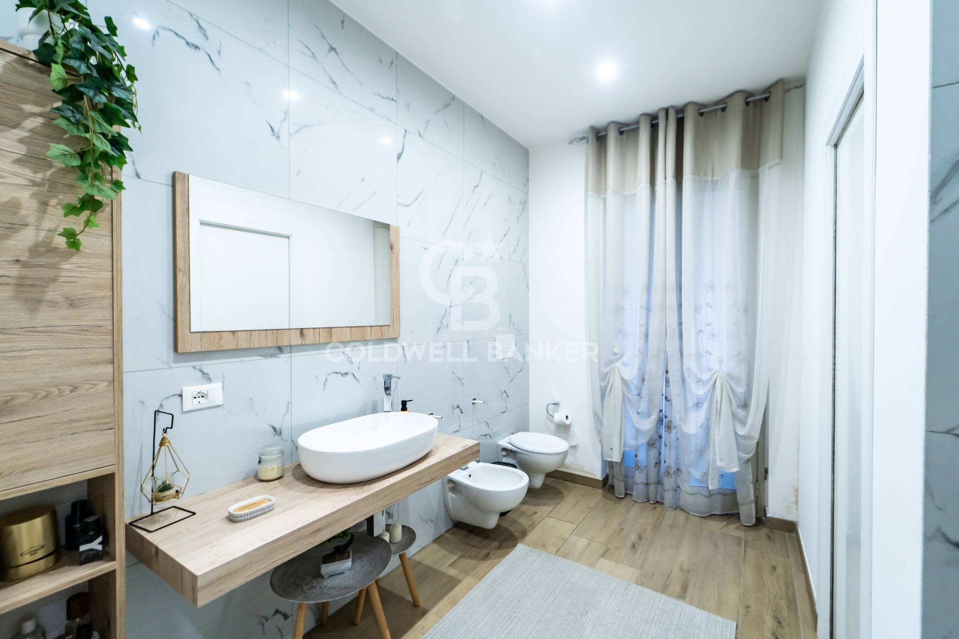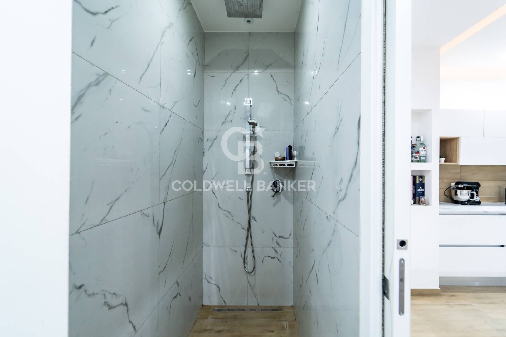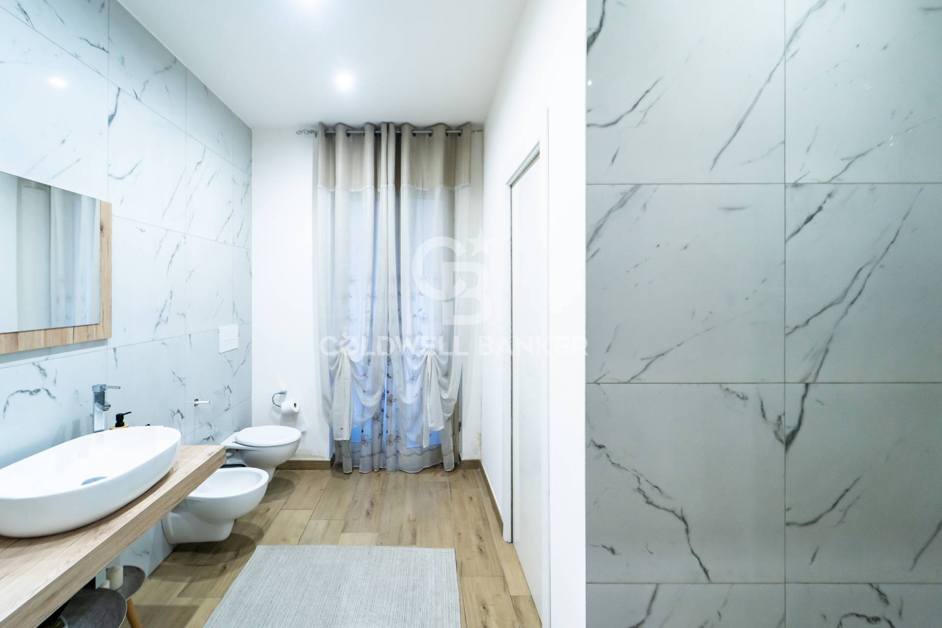 A completare labitazione, un ampio bagno dal design contemporaneo, impreziosito da una doccia filo pavimento e finiture di qualit, espressione di gusto e ricercatezza.