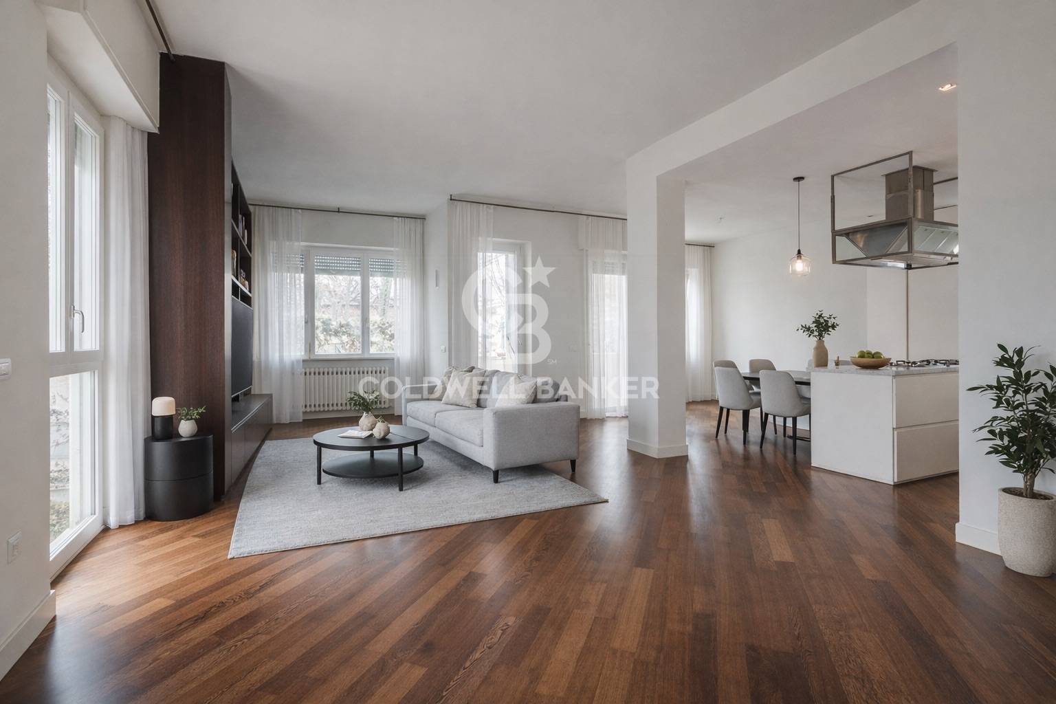 La zona giorno si apre su un ampio living open space, valorizzato da un parquet caldo e continuo e da grandi aperture che rendono gli ambienti ariosi e accoglienti.