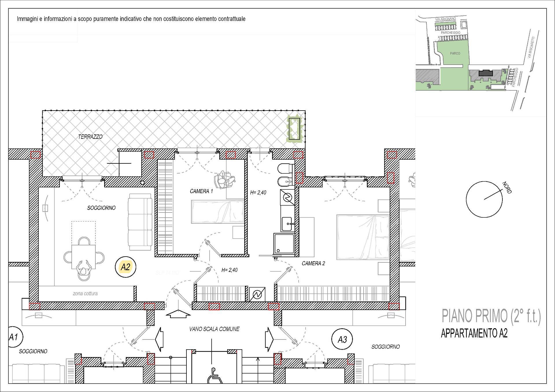Palazzina A - Unit A2 Consegna prevista: NOVEMBRE 2026 Appartamento al primo piano con ascensore, composto da ingresso su soggiorno con angolo cottura, due camere da letto, bagno finestrato.