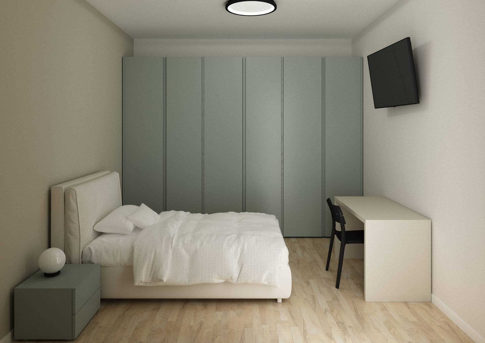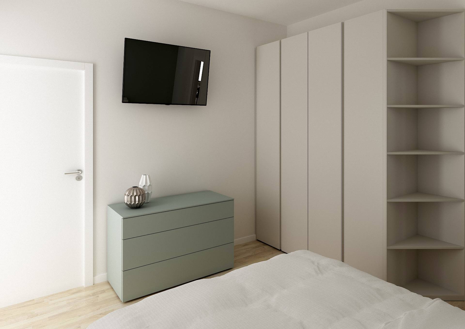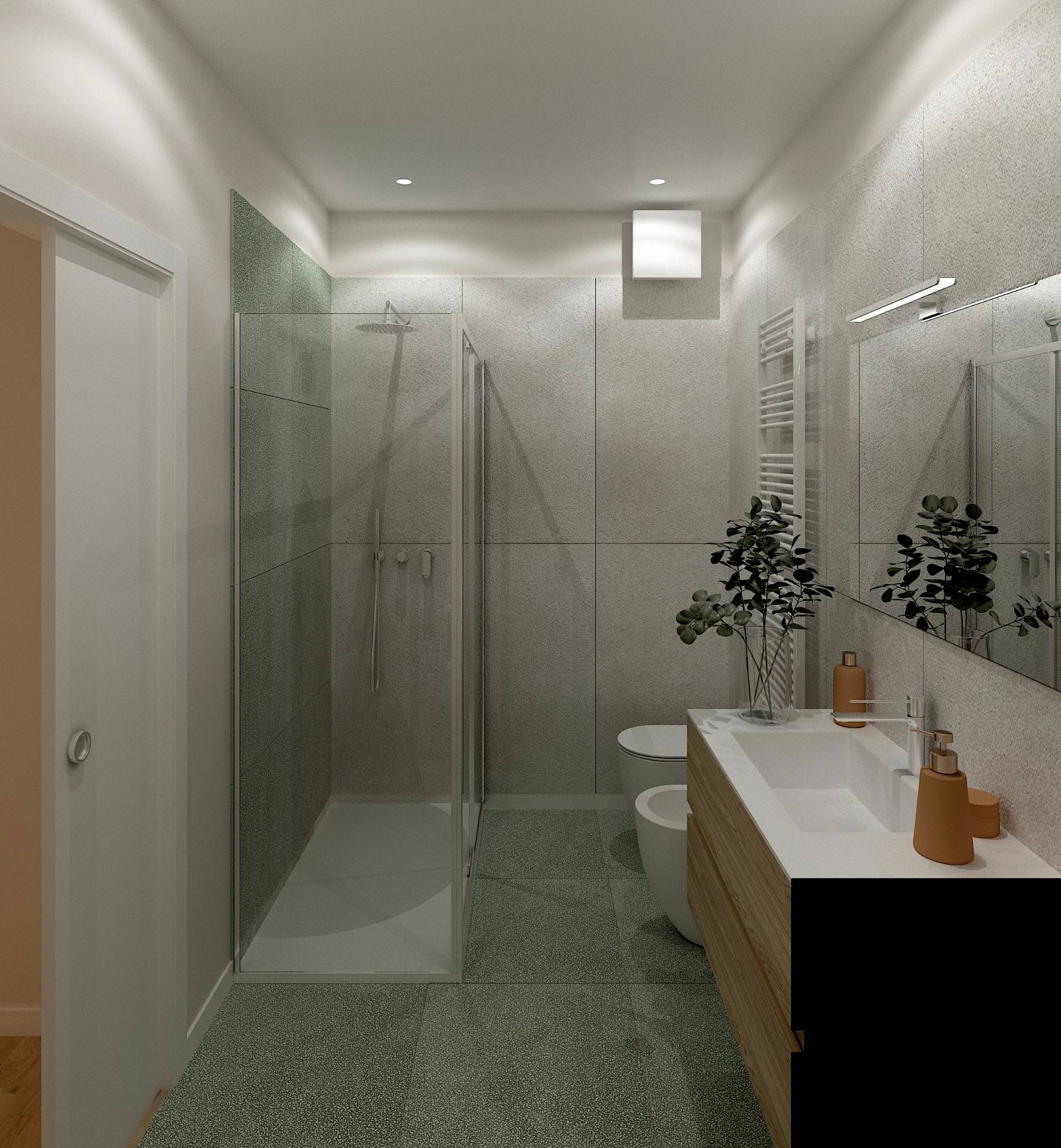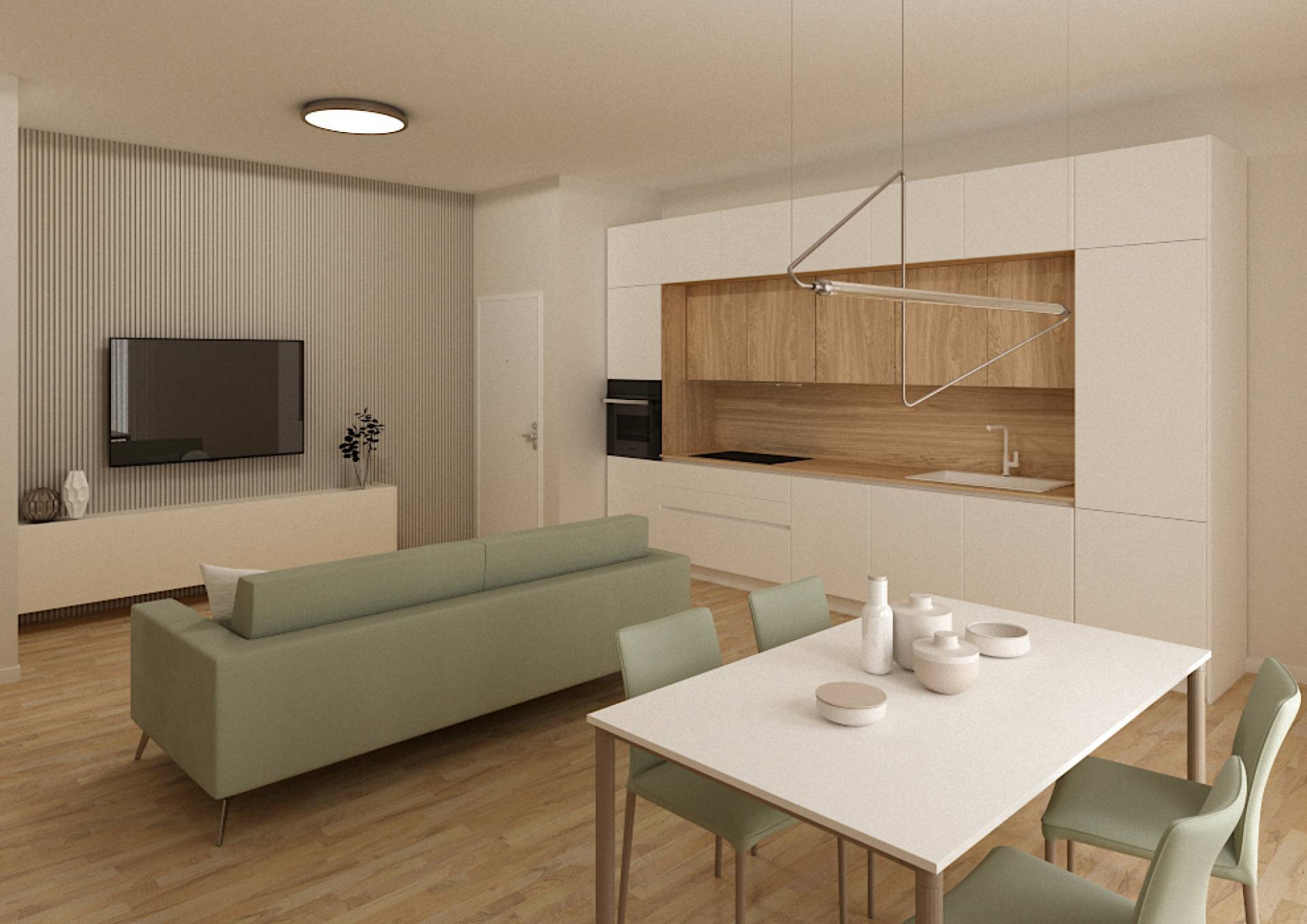 Appartamento moderno con ampio open space, due camere, doppi servizi e balcone perimetrale in piccolo stabile senza condominio.