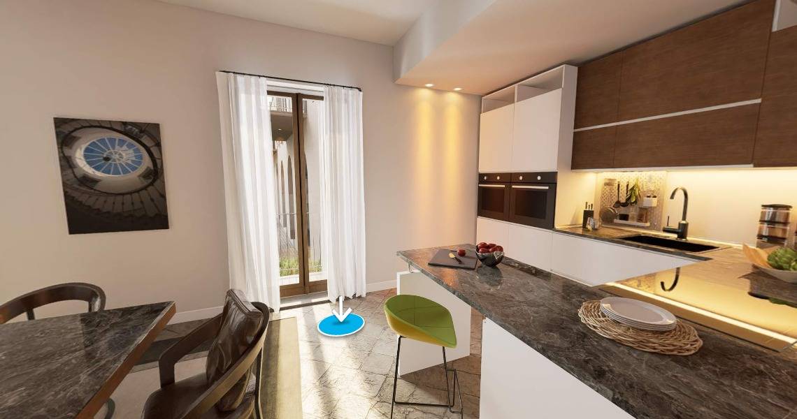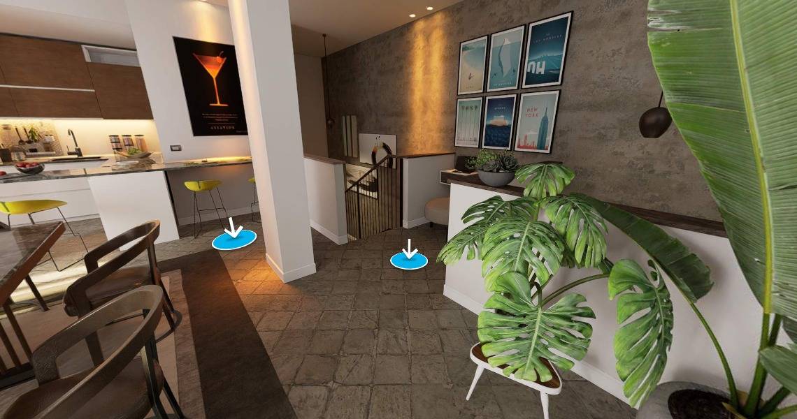 Il piano rialzato si apre su un ampio e luminoso soggiorno living con angolo cottura, ideale per momenti di convivialit.