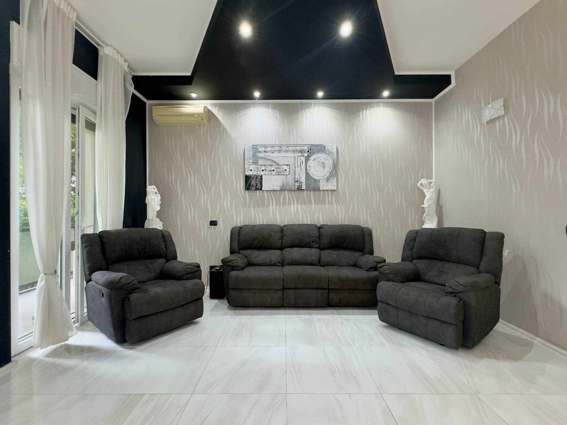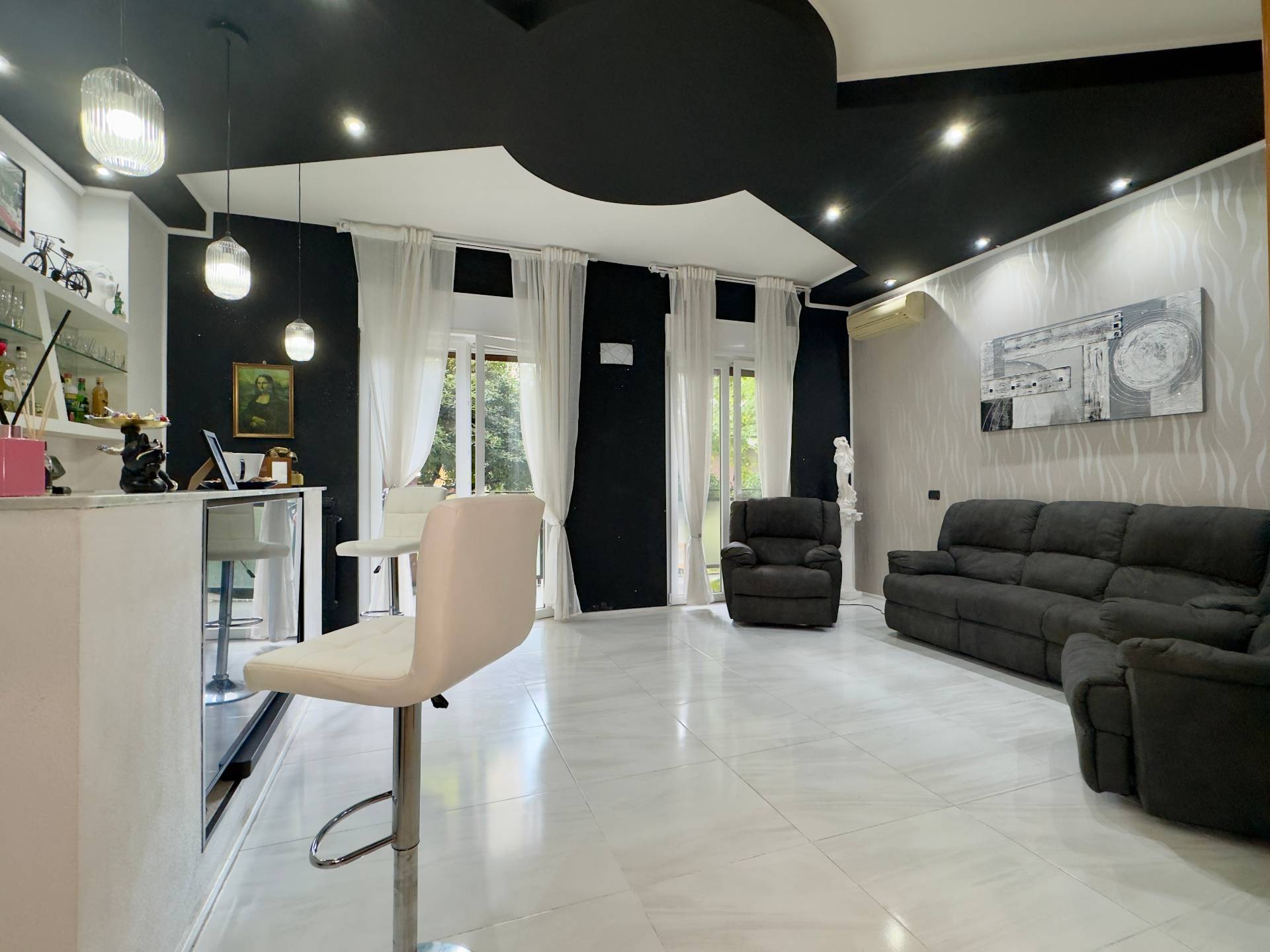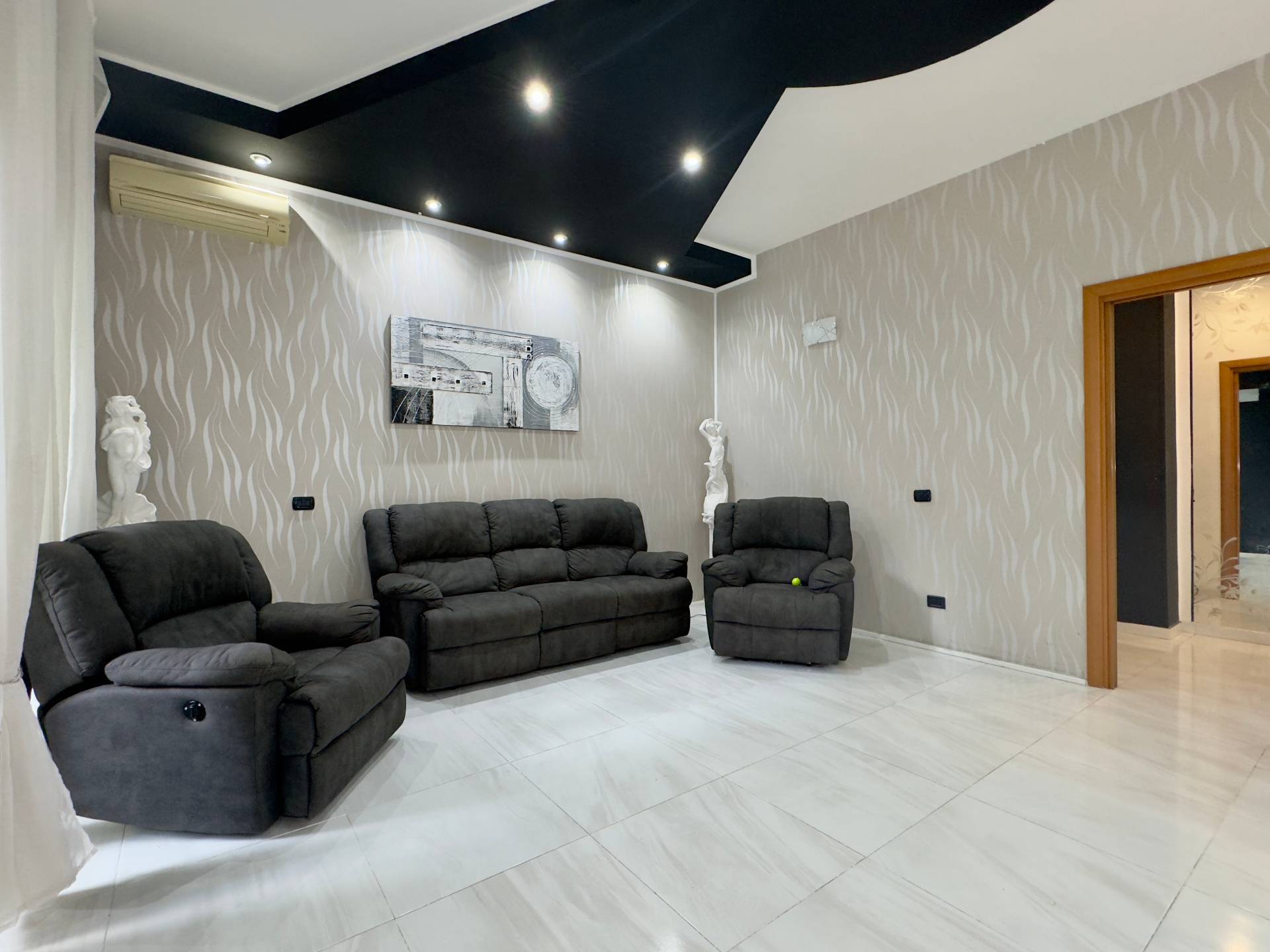 Ottimo lo stato interno della casa, con serramenti in pvc doppio vetro, porte interne in legno e vetro, aria condizionata presente nelle zone principali, quali soggiorno e camera matrimoniale, la pavimentazione in gres effetto marmo nella cucina abitabile mentre, nella camera da letto e nel bagno la pavimentazione in gres porcellanato effetto legno scuro, per quanto riguarda il resto della soluzione, la pavimentazione in gres porcellanato lucido.