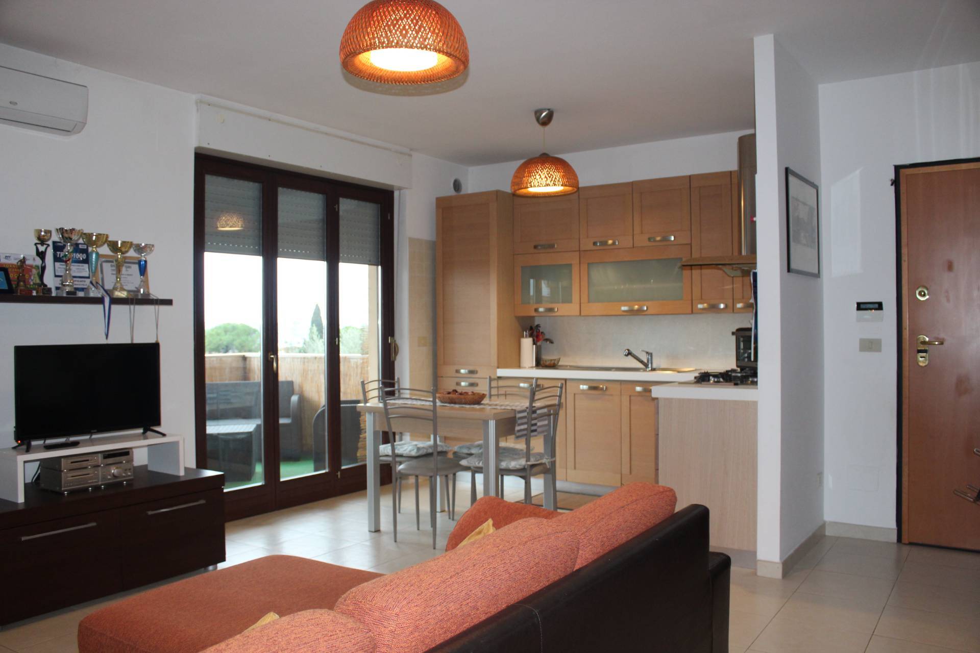 Appartamento posto al primo piano composto da: ingresso, soggiorno con camino, ampio angolo cottura, camera, cameretta, due bagni, due terrazzi a livello, giardino accessibile da uno dei terrazzi, competa la propriet un locale garage di 32 mq posto al piano terra, posto auto recintato.