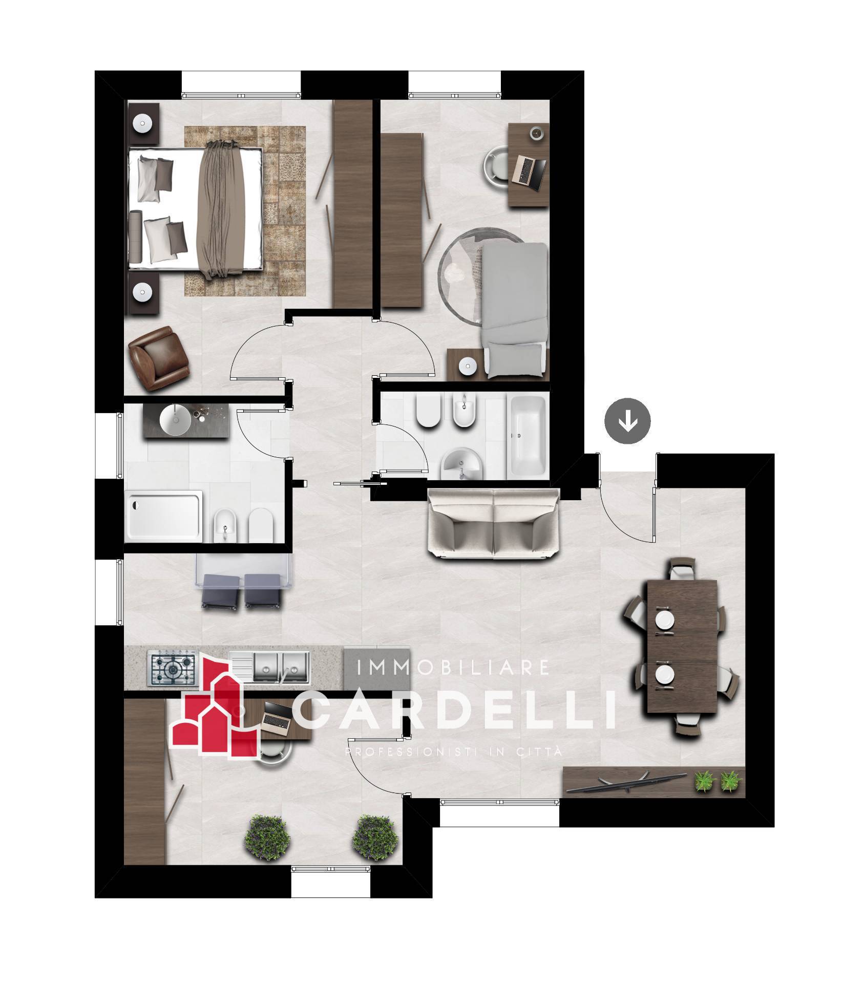 L'appartamento di mq 102 al piano terra si compone di ingresso su un'ampia e luminosa zona giorno, che comprende una zona pranzo - soggiorno e cucina a vista, spaziosa zona living dalla quale si accede a zona notte suddivisa in una camera matrimoniale e due bagni.